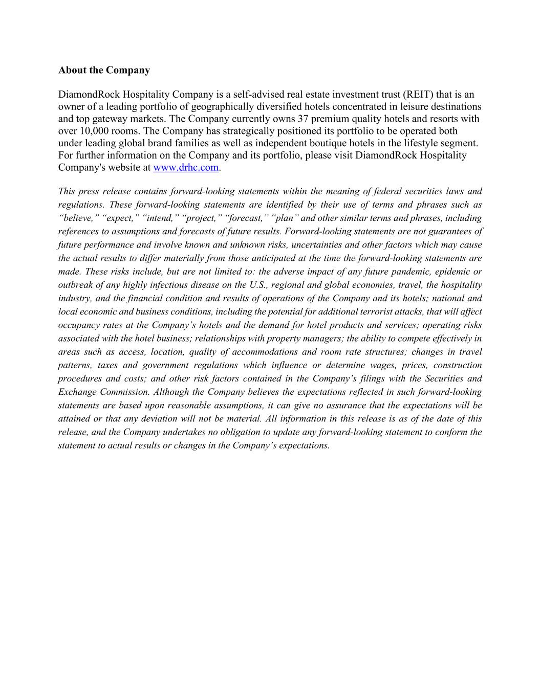 About the Company DiamondRock Hospitality Company is a self-advised real estate investment trust (REIT) that is an owner of a leading portfolio of geographically diversified hotels concentrated in leisure destinations and top gateway markets. The Company currently owns 37 premium quality hotels and resorts with over 10,000 rooms. The Company has strategically positioned its portfolio to be operated both under leading global brand families as well as independent boutique hotels in the lifestyle segment. For further information on the Company and its portfolio, please visit DiamondRock Hospitality Company's website at www.drhc.com. This press release contains forward-looking statements within the meaning of federal securities laws and regulations. These forward-looking statements are identified by their use of terms and phrases such as “believe,” “expect,” “intend,” “project,” “forecast,” “plan” and other similar terms and phrases, including references to assumptions and forecasts of future results. Forward-looking statements are not guarantees of future performance and involve known and unknown risks, uncertainties and other factors which may cause the actual results to differ materially from those anticipated at the time the forward-looking statements are made. These risks include, but are not limited to: the adverse impact of any future pandemic, epidemic or outbreak of any highly infectious disease on the U.S., regional and global economies, travel, the hospitality industry, and the financial condition and results of operations of the Company and its hotels; national and local economic and business conditions, including the potential for additional terrorist attacks, that will affect occupancy rates at the Company’s hotels and the demand for hotel products and services; operating risks associated with the hotel business; relationships with property managers; the ability to compete effectively in areas such as access, location, quality of accommodations and room rate structures; changes in travel patterns, taxes and government regulations which influence or determine wages, prices, construction procedures and costs; and other risk factors contained in the Company’s filings with the Securities and Exchange Commission. Although the Company believes the expectations reflected in such forward-looking statements are based upon reasonable assumptions, it can give no assurance that the expectations will be attained or that any deviation will not be material. All information in this release is as of the date of this release, and the Company undertakes no obligation to update any forward-looking statement to conform the statement to actual results or changes in the Company’s expectations.