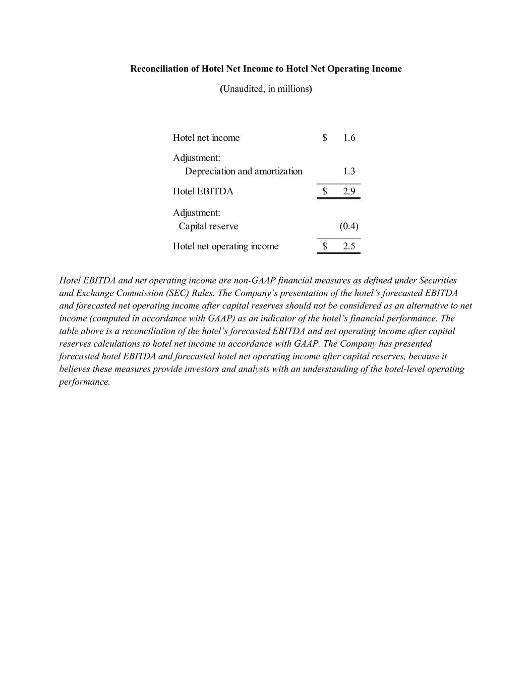Reconciliation of Hotel Net Income to Hotel Net Operating Income (Unaudited, in millions) Hotel EBITDA and net operating income are non-GAAP financial measures as defined under Securities and Exchange Commission (SEC) Rules. The Company’s presentation of the hotel’s forecasted EBITDA and forecasted net operating income after capital reserves should not be considered as an alternative to net income (computed in accordance with GAAP) as an indicator of the hotel’s financial performance. The table above is a reconciliation of the hotel’s forecasted EBITDA and net operating income after capital reserves calculations to hotel net income in accordance with GAAP. The Company has presented forecasted hotel EBITDA and forecasted hotel net operating income after capital reserves, because it believes these measures provide investors and analysts with an understanding of the hotel-level operating performance. Hotel net income 1.6$ Adjustment: Depreciation and amortization 1.3 Hotel EBITDA 2.9$ Adjustment: Capital reserve (0.4) Hotel net operating income 2.5$