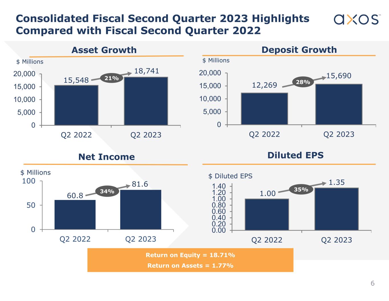 5 Consumer Banking Commercial BankingSecurities Axos Financial’s Three Divisions Provide the Foundation for Sustained Long-term Growth › Diverse mix of asset, deposit, and fee income reduces risk and provides multiple growth opportunities in varying environments › Differentiated retail digital strategy from “online savings banks” or fin-tech competitors › Structural cost advantage vs. traditional banks › Differentiated distribution strategy › New business initiatives generate incremental growth › Universal Digital Banking Platform and Enterprise Technology stack provide operating leverage opportunity › Technology synergies among divisions reduce overall cost of growth strategy Investment Thesis