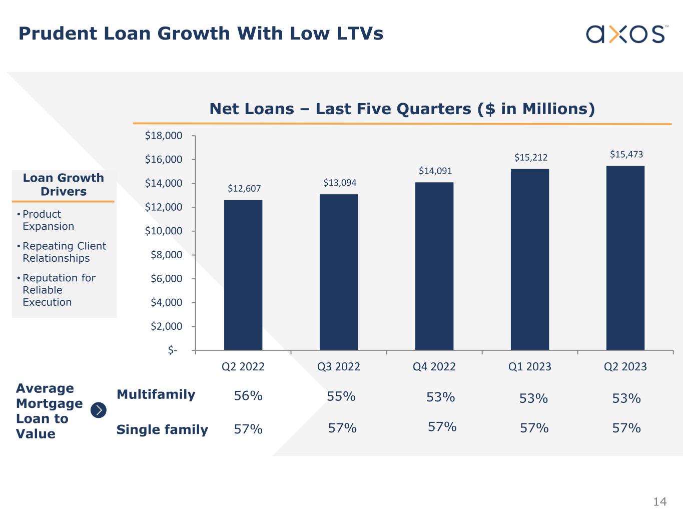 13 Loan Growth by Category for Second Quarter Ended December 31, 2022 Loans Single Family Mortgage & Warehouse Multifamily & Commercial Mortgage Commercial Real Estate Auto & Consumer Jumbo Mortgage Multifamily Small Balance Commercial Lender Finance RE SF Warehouse Lending Asset-Based Lending Auto CRE Specialty Unsecured / OD Equipment Leasing Q2 FY23 $ millions Other Q1 FY23 $3,845 144 2,175 875 4,981 781 125 555 77 7 $12 (33) 48 37 133 105 (13) (2) 3 Inc (Dec) Commercial & Industrial Non-RE* Lender Finance Non-RE 1,391 (90) 693 68 $15,649 $15,384 $265 (3) $3,833 177 2,127 838 4,848 676 138 557 74 10 1,481 625