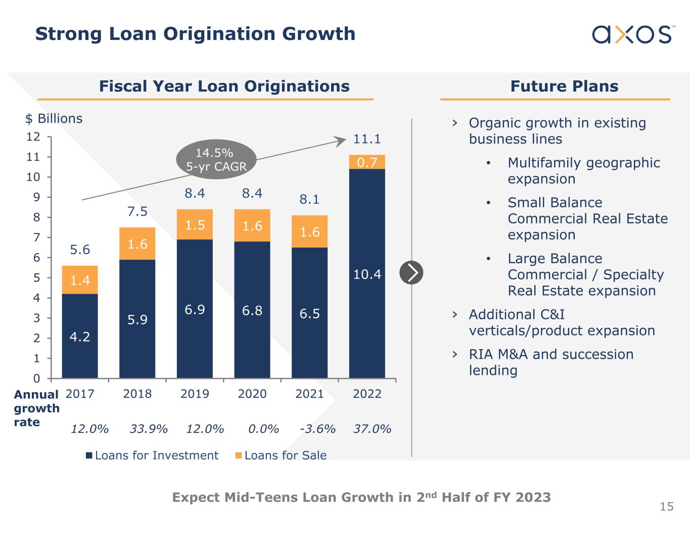 15 4.2 5.9 6.9 6.8 6.5 10.41.4 1.6 1.5 1.6 1.6 0.7 5.6 7.5 8.4 8.4 8.1 11.1 0 1 2 3 4 5 6 7 8 9 10 11 12 2017 2018 2019 2020 2021 2022 $ Billions Loans for Investment Loans for Sale Strong Loan Origination Growth 12.0% 33.9% 12.0% › Organic growth in existing business lines • Multifamily geographic expansion • Small Balance Commercial Real Estate expansion • Large Balance Commercial / Specialty Real Estate expansion › Additional C&I verticals/product expansion › RIA M&A and succession lending Annual growth rate Fiscal Year Loan Originations Future Plans 14.5% 5-yr CAGR 0.0% -3.6% Expect Mid-Teens Loan Growth in 2nd Half of FY 2023 37.0%