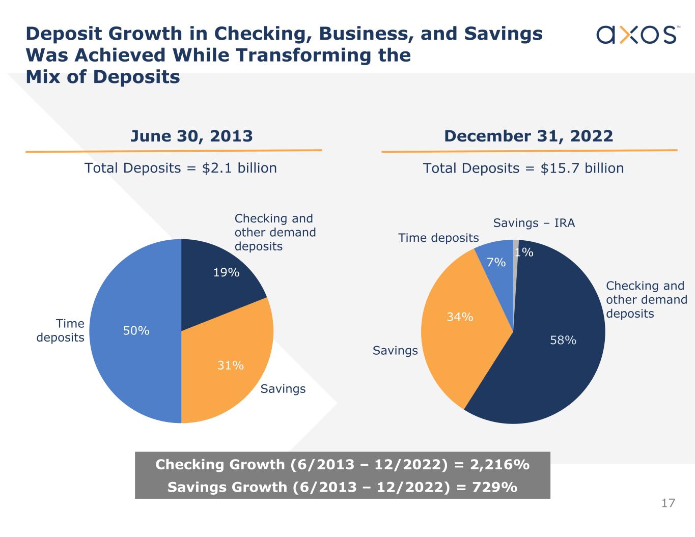 16 Consumer  Direct Distribution  Partners Small Business  Banking Commercial /  Treasury  Management Axos Securities Specialty  Deposits Fiduciary  Services Diversified Deposit Gathering Business Lines ‹ Full service digital banking, wealth management, and securities trading ‹ White-label banking ‹ Business banking with simple suite of cash management services ‹ Fiduciary services for trustees ‹ 1031 exchange firms ‹ Title and escrow companies ‹ HOA and property management ‹ Serves approximately 40% of U.S. Chapter 7 bankruptcy trustees in exclusive relationship ‹ Software allows servicing of SEC receivers and non-chapter 7 cases ‹ Full service treasury/cash management ‹ Team enhancements and geographic expansion ‹ Bank and securities cross-sell ‹ Broker-dealer client cash ‹ Broker-dealer reserve accounts $1.1 B $1.2 B $5.6 B $0.8 B $0.4 B $5.1 B $1.5 B Diversified Deposit Gathering * Deposit balances as of 12/31/22.