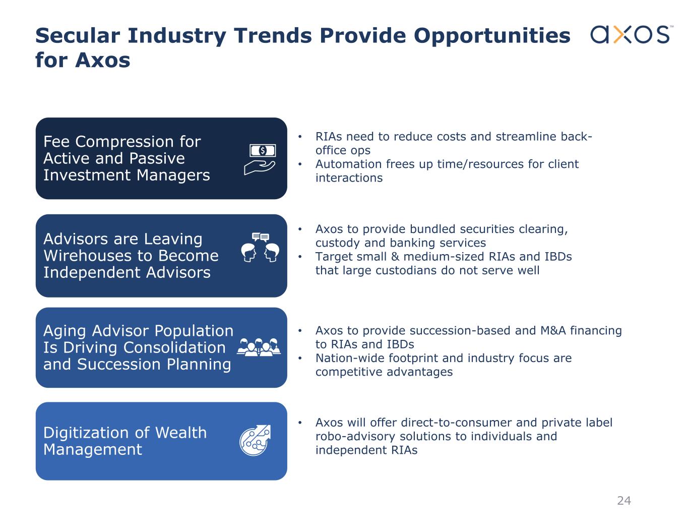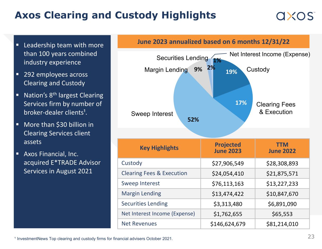 23¹ InvestmentNews Top clearing and custody firms for financial advisers October 2021. Axos Clearing and Custody Highlights  Leadership team with more  than 100 years combined  industry experience  292 employees across  Clearing and Custody    Nation’s 8th largest Clearing  Services firm by number of  broker‐dealer clients¹.  More than $30 billion in  Clearing Services client  assets  Axos Financial, Inc.  acquired E*TRADE Advisor  Services in August 2021 June 2023 annualized based on 6 months 12/31/22 19% 17% 52% 9% 2% 1% Key Highlights Projected  June 2023 TTM  June 2022 Custody $27,906,549 $28,308,893 Clearing Fees & Execution $24,054,410 $21,875,571  Sweep Interest  $76,113,163 $13,227,233 Margin Lending $13,474,422 $10,847,670 Securities Lending $3,313,480 $6,891,090 Net Interest Income (Expense) $1,762,655 $65,553 Net Revenues $146,624,679 $81,214,010 Custody Sweep Interest Margin Lending Securities Lending Net Interest Income (Expense) Clearing Fees & Execution