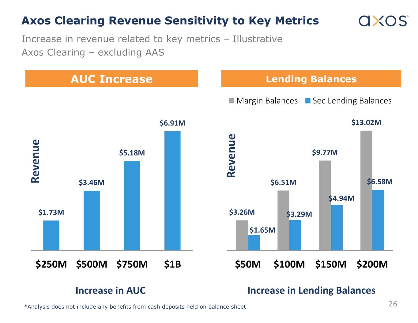 Lending BalancesAUC Increase $1.73M $3.46M $5.18M $6.91M $250M $500M $750M $1B Re ve nu e $3.26M $6.51M $9.77M $13.02M $1.65M $3.29M $4.94M $6.58M $50M $100M $150M $200M Re ve nu e Margin Balances Sec Lending Balances Axos Clearing Revenue Sensitivity to Key Metrics Increase in revenue related to key metrics – Illustrative Axos Clearing – excluding AAS Increase in AUC *Analysis does not include any benefits from cash deposits held on balance sheet Increase in Lending Balances 26