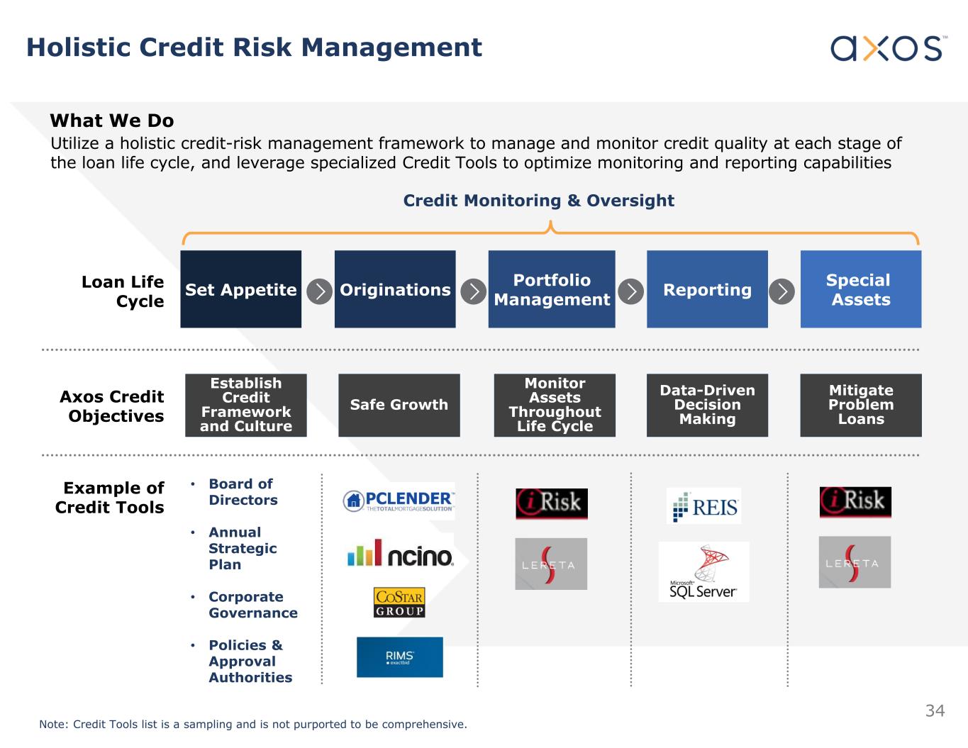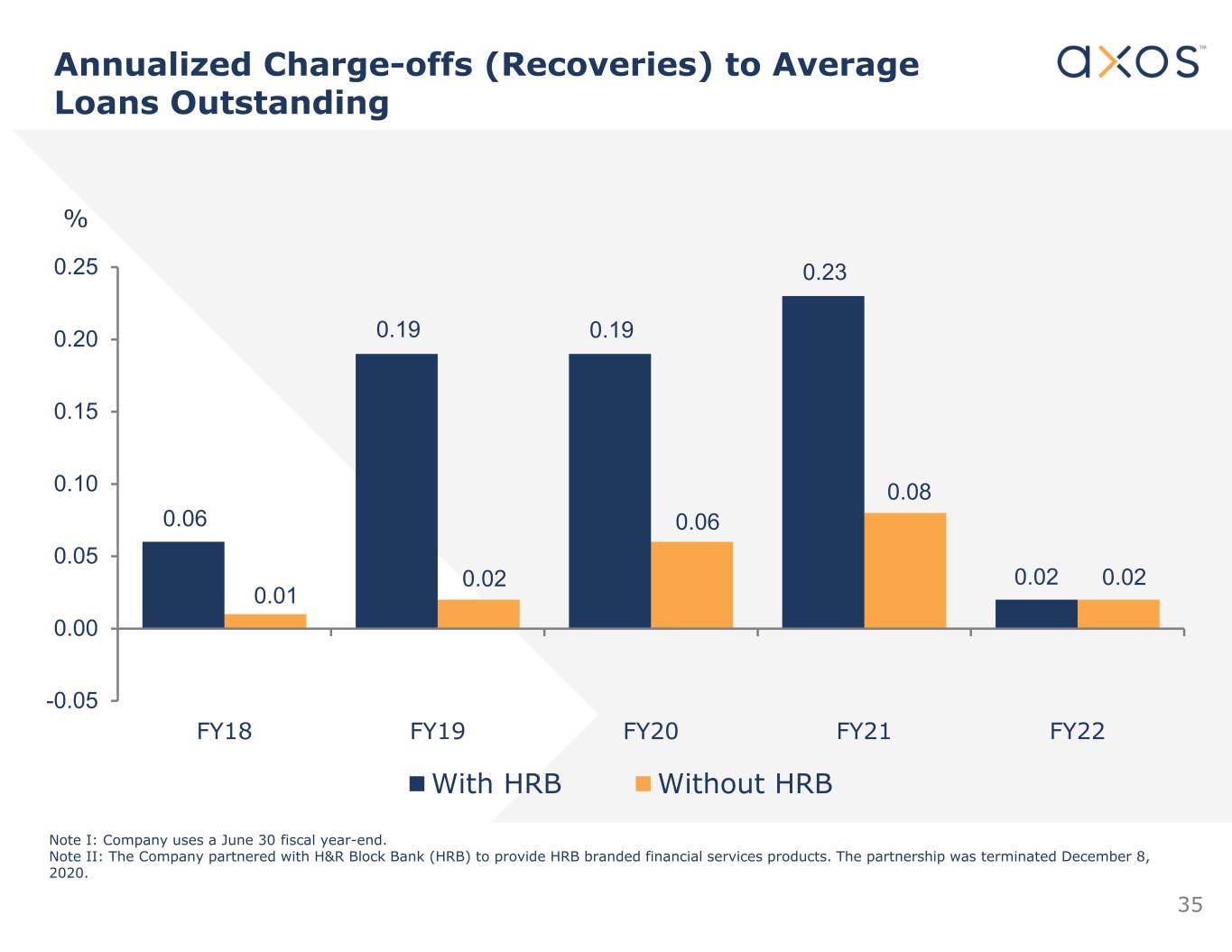 34 Holistic Credit Risk Management What We Do Loan Life Cycle Utilize a holistic credit-risk management framework to manage and monitor credit quality at each stage of the loan life cycle, and leverage specialized Credit Tools to optimize monitoring and reporting capabilities Set Appetite Originations Portfolio Management Reporting Special Assets Credit Monitoring & Oversight Axos Credit Objectives Establish Credit Framework and Culture Safe Growth Monitor Assets Throughout Life Cycle Data-Driven Decision Making Mitigate Problem Loans Example of Credit Tools • Board of Directors • Annual Strategic Plan • Corporate Governance • Policies & Approval Authorities Note: Credit Tools list is a sampling and is not purported to be comprehensive.