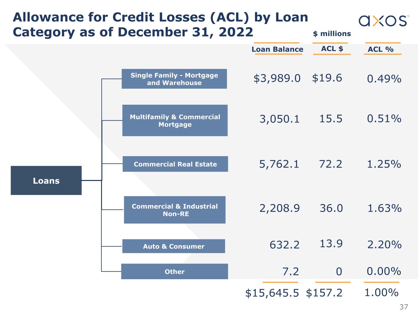 37 Allowance for Credit Losses (ACL) by Loan Category as of December 31, 2022 Loans Single Family - Mortgage and Warehouse Multifamily & Commercial Mortgage Commercial Real Estate Auto & Consumer Loan Balance $ millions Other ACL $ $3,989.0 3,050.1 5,762.1 632.2 7.2 ACL % Commercial & Industrial Non-RE 2,208.9 $15,645.5 15.5 72.2 13.9 0 36.0 $19.6 $157.2 1.00% 1.25% 0.51% 0.49% 0.00% 2.20% 1.63%