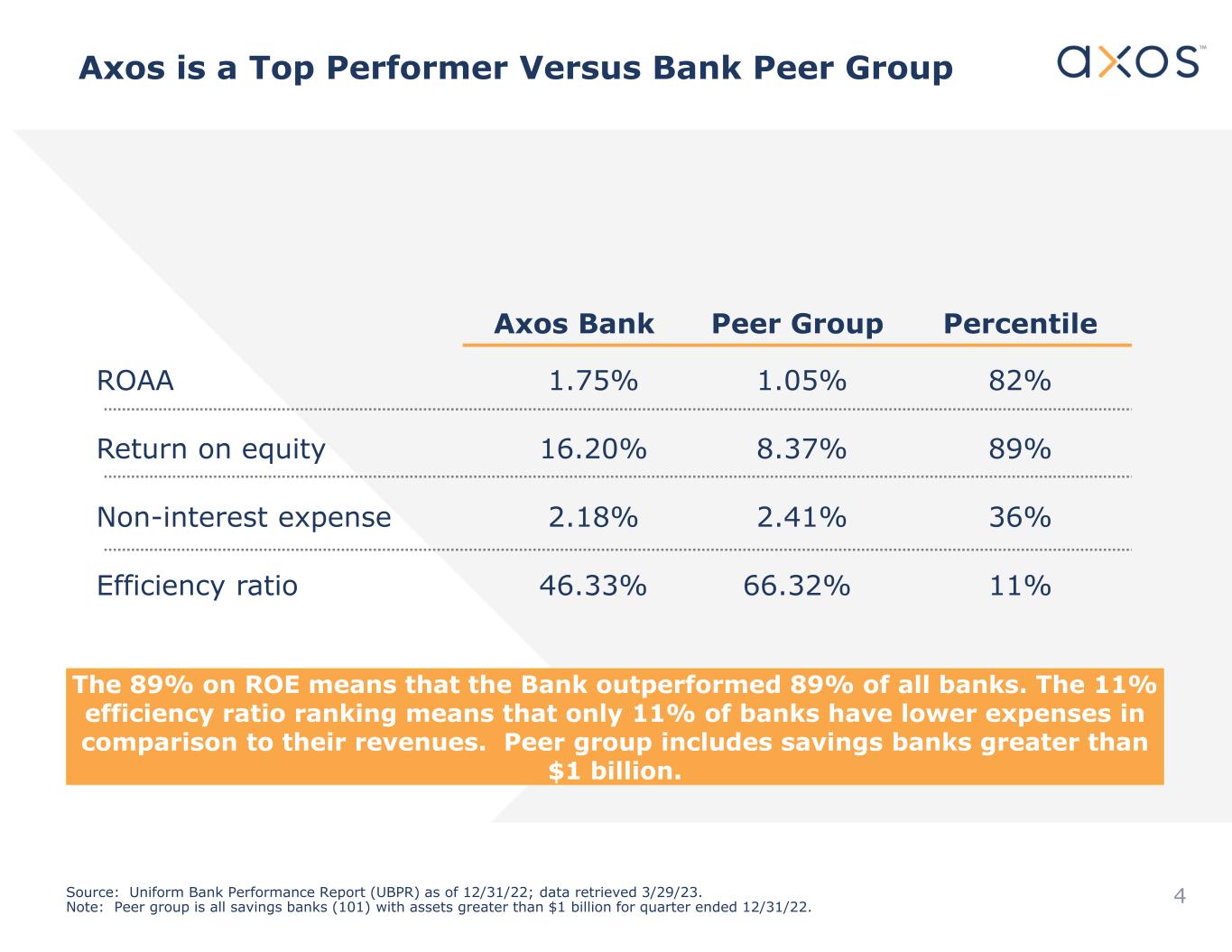 Axos is a Top Performer Versus Bank Peer Group 4 PercentilePeer GroupAxos Bank 82%1.05%1.75%ROAA 89%8.37%16.20%Return on equity 36%2.41%2.18%Non-interest expense 11%66.32%46.33%Efficiency ratio Source: Uniform Bank Performance Report (UBPR) as of 12/31/22; data retrieved 3/29/23. Note: Peer group is all savings banks (101) with assets greater than $1 billion for quarter ended 12/31/22. The 89% on ROE means that the Bank outperformed 89% of all banks. The 11% efficiency ratio ranking means that only 11% of banks have lower expenses in comparison to their revenues. Peer group includes savings banks greater than $1 billion.