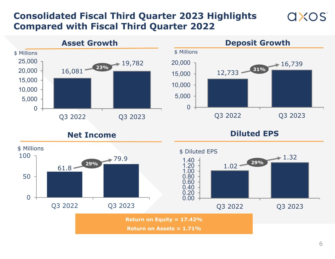 61.8 79.9 0 50 100 Q3 2022 Q3 2023 Consolidated Fiscal Third Quarter 2023 Highlights Compared with Fiscal Third Quarter 2022 6 16,081 19,782 0 5,000 10,000 15,000 20,000 25,000 Q3 2022 Q3 2023 $ Millions Asset Growth $ Millions Net Income 12,733 16,739 0 5,000 10,000 15,000 20,000 Q3 2022 Q3 2023 $ Millions Deposit Growth 1.02 1.32 0.00 0.20 0.40 0.60 0.80 1.00 1.20 1.40 Q3 2022 Q3 2023 $ Diluted EPS Diluted EPS Return on Equity = 17.42% Return on Assets = 1.71% 23% 31% 29%29%
