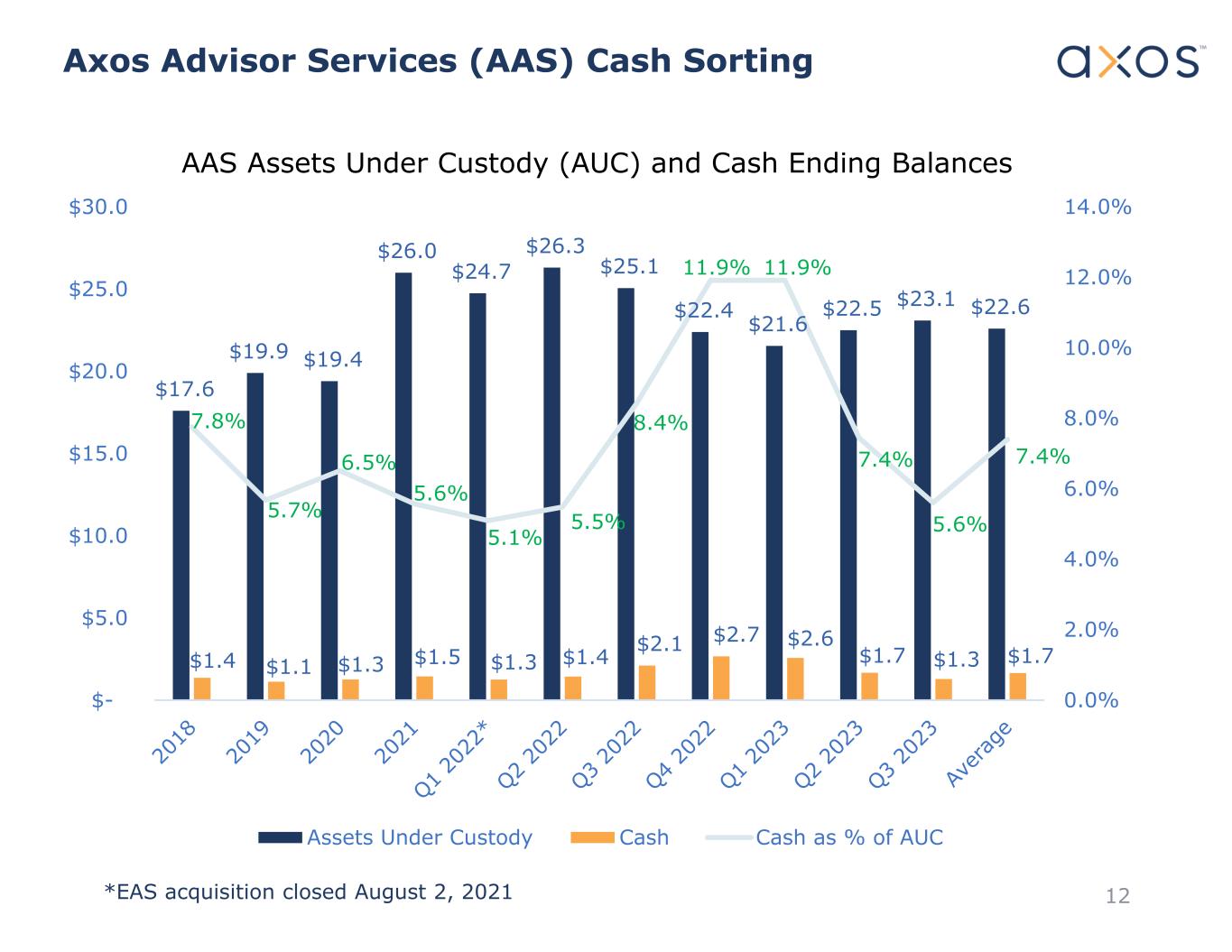 Axos Advisor Services (AAS) Cash Sorting 12*EAS acquisition closed August 2, 2021 $17.6 $19.9 $19.4 $26.0 $24.7 $26.3 $25.1 $22.4 $21.6 $22.5 $23.1 $22.6 $1.4 $1.1 $1.3 $1.5 $1.3 $1.4 $2.1 $2.7 $2.6 $1.7 $1.3 $1.7 7.8% 5.7% 6.5% 5.6% 5.1% 5.5% 8.4% 11.9% 11.9% 7.4% 5.6% 7.4% 0.0% 2.0% 4.0% 6.0% 8.0% 10.0% 12.0% 14.0% $- $5.0 $10.0 $15.0 $20.0 $25.0 $30.0 AAS Assets Under Custody (AUC) and Cash Ending Balances Assets Under Custody Cash Cash as % of AUC
