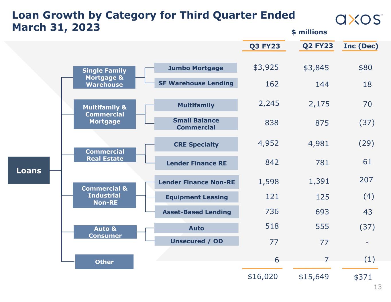 2 Safe Harbor This presentation contains forward-looking statements that involve risks and uncertainties, including without limitation statements relating to Axos’ financial prospects and other projections of its performance and asset quality, Axos’ deposit balances and capital ratios, Axos’ ability to continue to grow profitably and increase its business, Axos’ ability to continue to diversify its lending and deposit franchises, the anticipated timing and financial performance of other offerings, initiatives, and acquisitions, expectations of the environment in which Axos operates and projections of future performance. These forward-looking statements are made on the basis of the views and assumptions of management regarding future events and performance as of the date of this presentation. Actual results and the timing of events could differ materially from those expressed or implied in such forward-looking statements as a result of risks and uncertainties, including without limitation Axos’ ability to successfully integrate acquisitions and realize the anticipated benefits of the transactions, changes in the interest rate environment, monetary policy, inflation, government regulation, general economic conditions, changes in the competitive marketplace, conditions in the real estate markets in which we operate, risks associated with credit quality, our ability to attract and retain deposits and access other sources of liquidity, and the outcome and effects of litigation and other factors beyond our control. These and other risks and uncertainties detailed in Axos’ periodic reports filed with the Securities and Exchange Commission, including its 2022 Form 10-K, as supplemented by its Quarterly Report on Form 10-Q for the period ended December 31, 2022, could cause actual results to differ materially from those expressed or implied in any forward- looking statements. Readers are cautioned not to place undue reliance on these forward-looking statements, which speak only as of the date of this press release. All forward-looking statements are qualified in their entirety by this cautionary statement, and Axos undertakes no obligation to revise or update any forward-looking statements to reflect events or circumstances after the date of this press release. Axos undertakes no obligation to publicly update or revise any forward-looking statements, whether as a result of new information, future events or otherwise. All written and oral forward-looking statements made in connection with this presentation, which are attributable to us or persons acting on Axos’ behalf are expressly qualified in their entirety by the foregoing information.