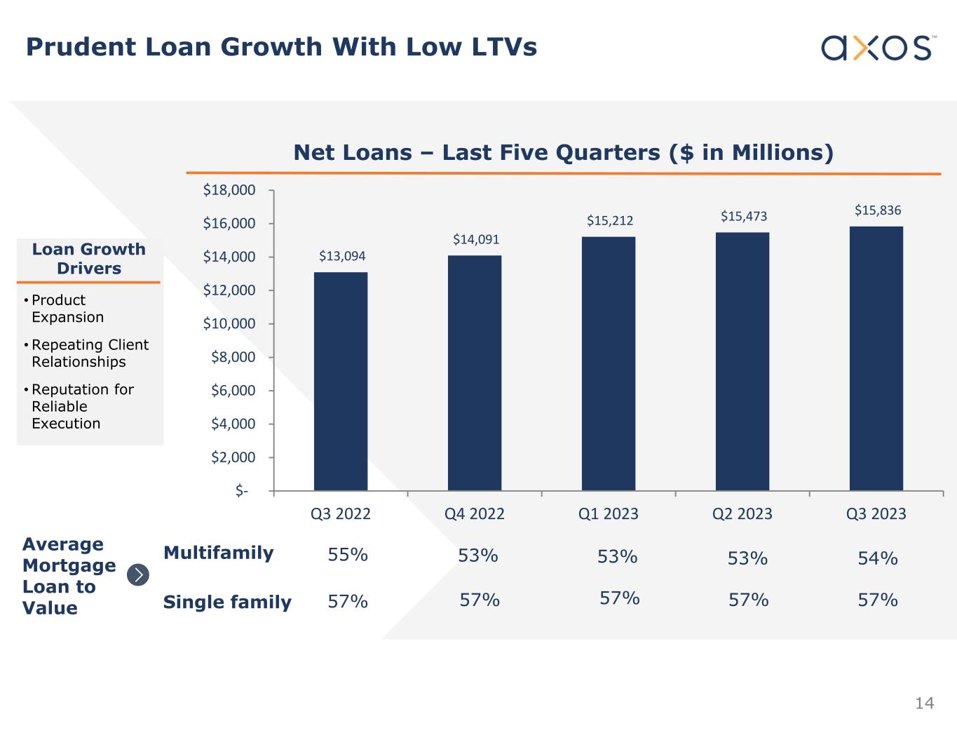 13 Loan Growth by Category for Third Quarter Ended March 31, 2023 Loans Single Family Mortgage & Warehouse Multifamily & Commercial Mortgage Commercial Real Estate Auto & Consumer Jumbo Mortgage Multifamily Small Balance Commercial Lender Finance RE SF Warehouse Lending Asset-Based Lending Auto CRE Specialty Unsecured / OD Equipment Leasing Q3 FY23 $ millions Other Q2 FY23 $80 18 70 (37) (29) 61 (4) (37) - Inc (Dec) Commercial & Industrial Non-RE Lender Finance Non-RE 207 43 $16,020 $15,649 $371 (1) $3,845 144 2,175 875 4,981 781 125 555 77 7 1,391 693 $3,925 162 2,245 838 4,952 842 121 518 77 6 1,598 736