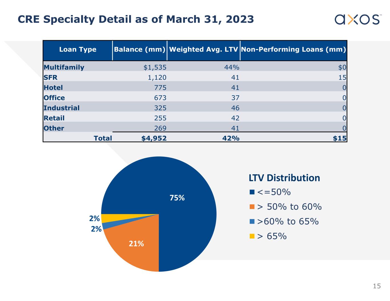 14 Multifamily Single family 55% 57% Average Mortgage Loan to Value $13,094  $14,091  $15,212  $15,473  $15,836   $‐  $2,000  $4,000  $6,000  $8,000  $10,000  $12,000  $14,000  $16,000  $18,000 Q3 2022 Q4 2022 Q1 2023 Q2 2023 Q3 2023 53% 57% 53% 57% • Product Expansion • Repeating Client Relationships • Reputation for Reliable Execution Loan Growth Drivers Net Loans – Last Five Quarters ($ in Millions) Prudent Loan Growth With Low LTVs 53% 57% 54% 57%