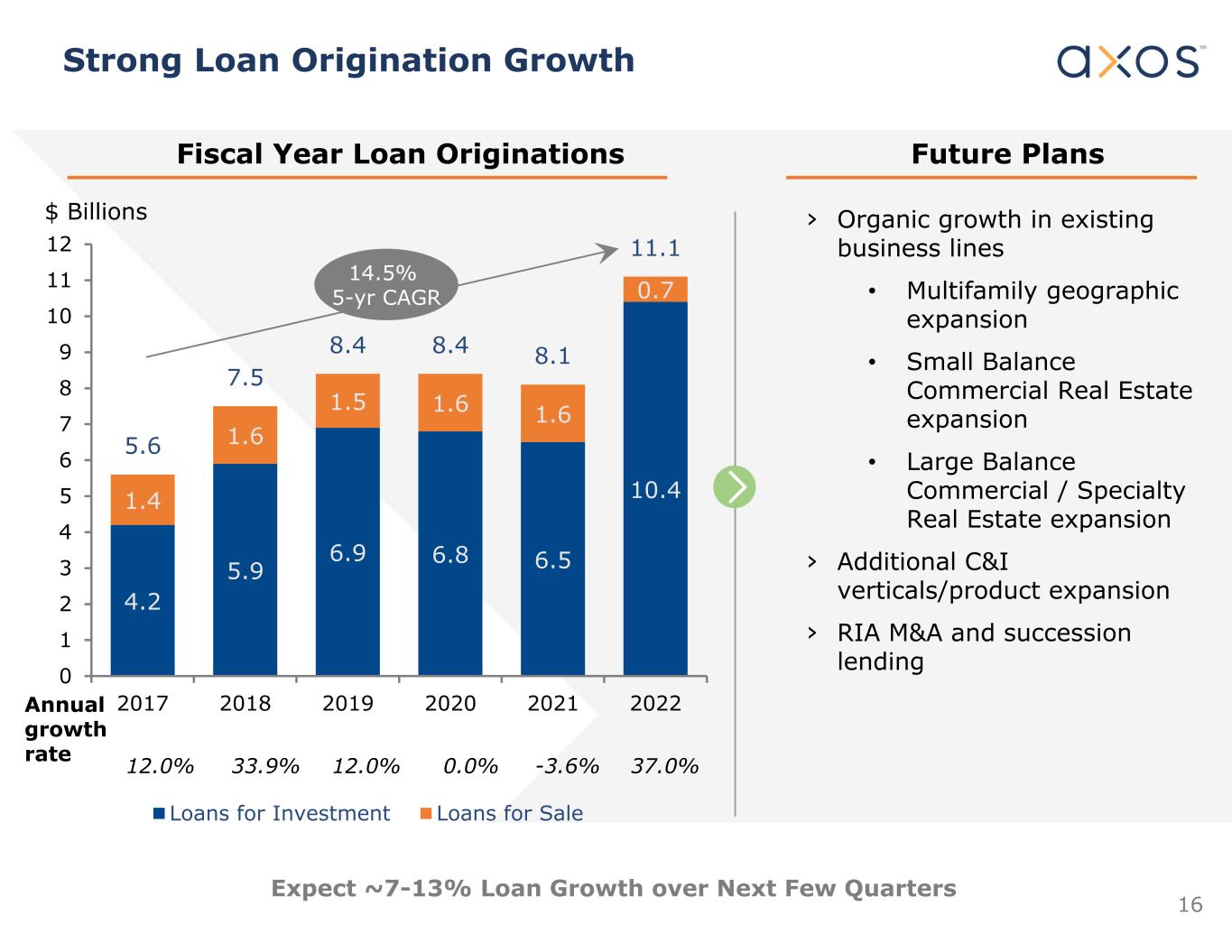 16 4.2 5.9 6.9 6.8 6.5 10.41.4 1.6 1.5 1.6 1.6 0.7 5.6 7.5 8.4 8.4 8.1 11.1 0 1 2 3 4 5 6 7 8 9 10 11 12 2017 2018 2019 2020 2021 2022 $ Billions Loans for Investment Loans for Sale Strong Loan Origination Growth 12.0% 33.9% 12.0% › Organic growth in existing business lines • Multifamily geographic expansion • Small Balance Commercial Real Estate expansion • Large Balance Commercial / Specialty Real Estate expansion › Additional C&I verticals/product expansion › RIA M&A and succession lending Annual growth rate Fiscal Year Loan Originations Future Plans 14.5% 5-yr CAGR 0.0% -3.6% Expect ~7-13% Loan Growth over Next Few Quarters 37.0%