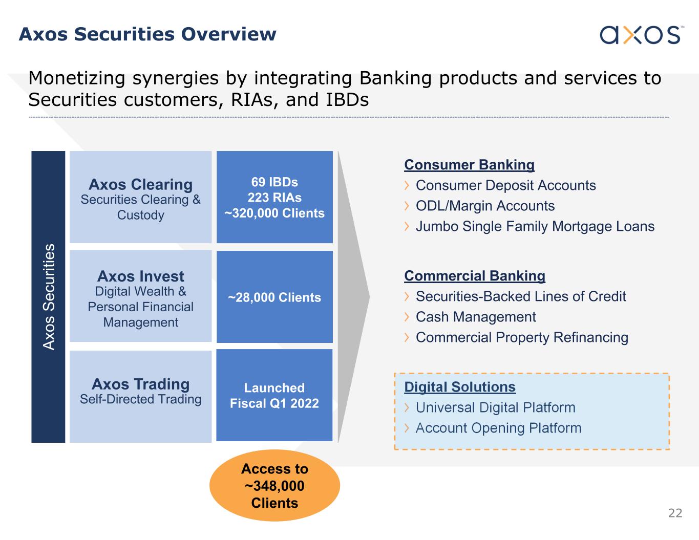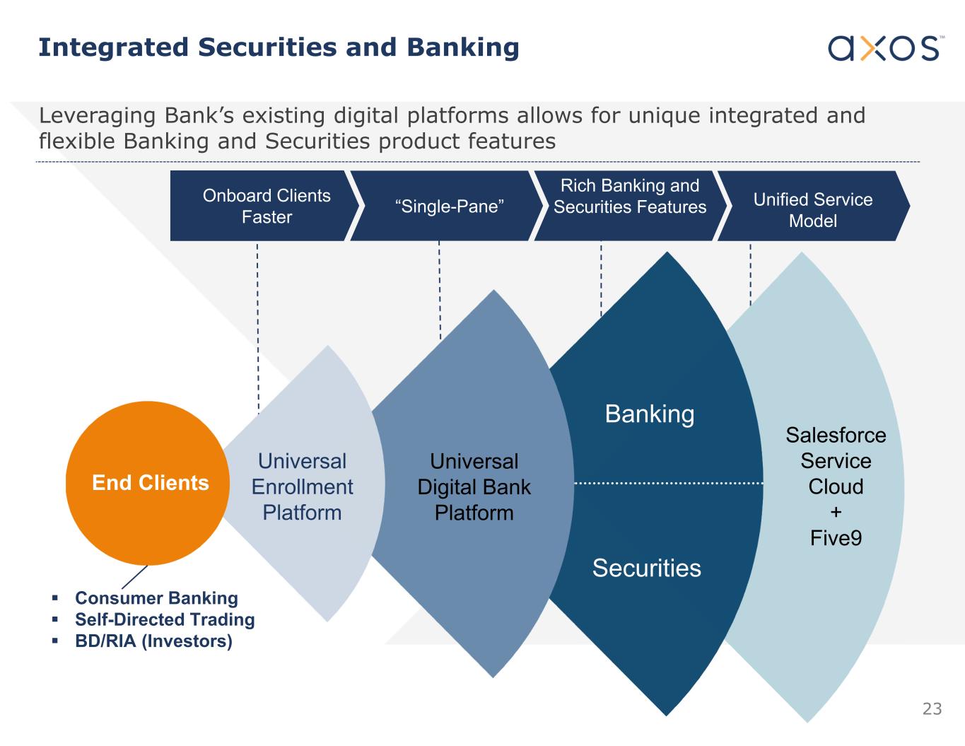 22 Axos Clearing Securities Clearing & Custody Axos Invest Digital Wealth & Personal Financial Management Axos Trading Self-Directed Trading Ax os S ec ur iti es 69 IBDs 223 RIAs ~320,000 Clients ~28,000 Clients Launched Fiscal Q1 2022 Consumer Banking Consumer Deposit Accounts ODL/Margin Accounts Jumbo Single Family Mortgage Loans Commercial Banking Securities-Backed Lines of Credit Cash Management Commercial Property Refinancing Digital Solutions Universal Digital Platform Account Opening Platform Access to ~348,000 Clients Monetizing synergies by integrating Banking products and services to Securities customers, RIAs, and IBDs .  Axos Securities Overview
