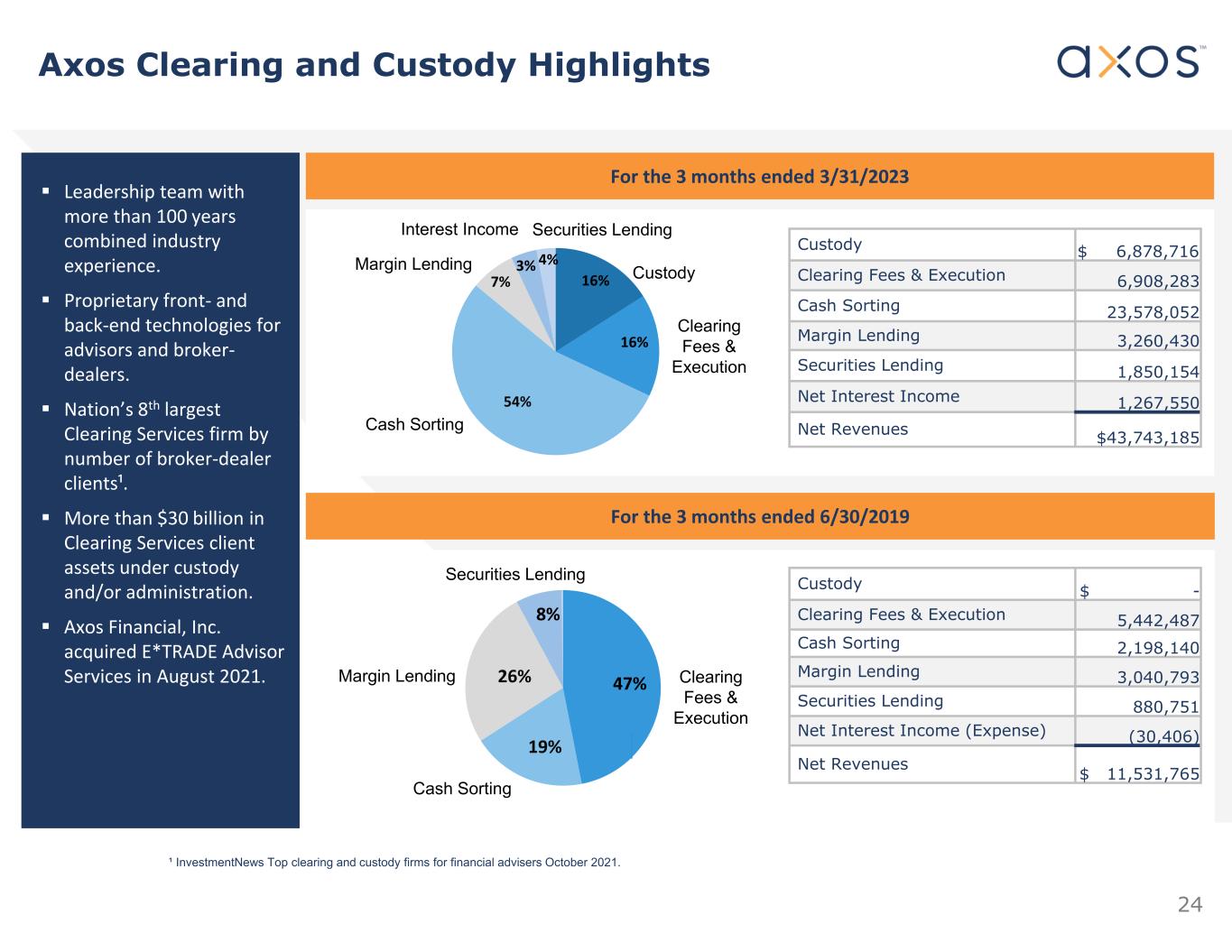 24 ¹ InvestmentNews Top clearing and custody firms for financial advisers October 2021.  Leadership team with  more than 100 years  combined industry  experience.  Proprietary front‐ and  back‐end technologies for  advisors and broker‐ dealers.    Nation’s 8th largest  Clearing Services firm by  number of broker‐dealer  clients¹.  More than $30 billion in  Clearing Services client  assets under custody  and/or administration.  Axos Financial, Inc.  acquired E*TRADE Advisor  Services in August 2021. For the 3 months ended 3/31/2023 For the 3 months ended 6/30/2019 47% 19% 26% 8% Securities Lending Margin Lending Cash Sorting Clearing Fees & Execution 16% 54% 7% 4%3% Securities Lending Margin Lending Cash Sorting Interest Income 16% Custody Clearing Fees & Execution $ 6,878,716 Custody 6,908,283 Clearing Fees & Execution 23,578,052 Cash Sorting 3,260,430 Margin Lending 1,850,154 Securities Lending 1,267,550 Net Interest Income $43,743,185 Net Revenues Axos Clearing and Custody Highlights $ -Custody 5,442,487 Clearing Fees & Execution 2,198,140 Cash Sorting 3,040,793 Margin Lending 880,751 Securities Lending (30,406) Net Interest Income (Expense) $ 11,531,765 Net Revenues