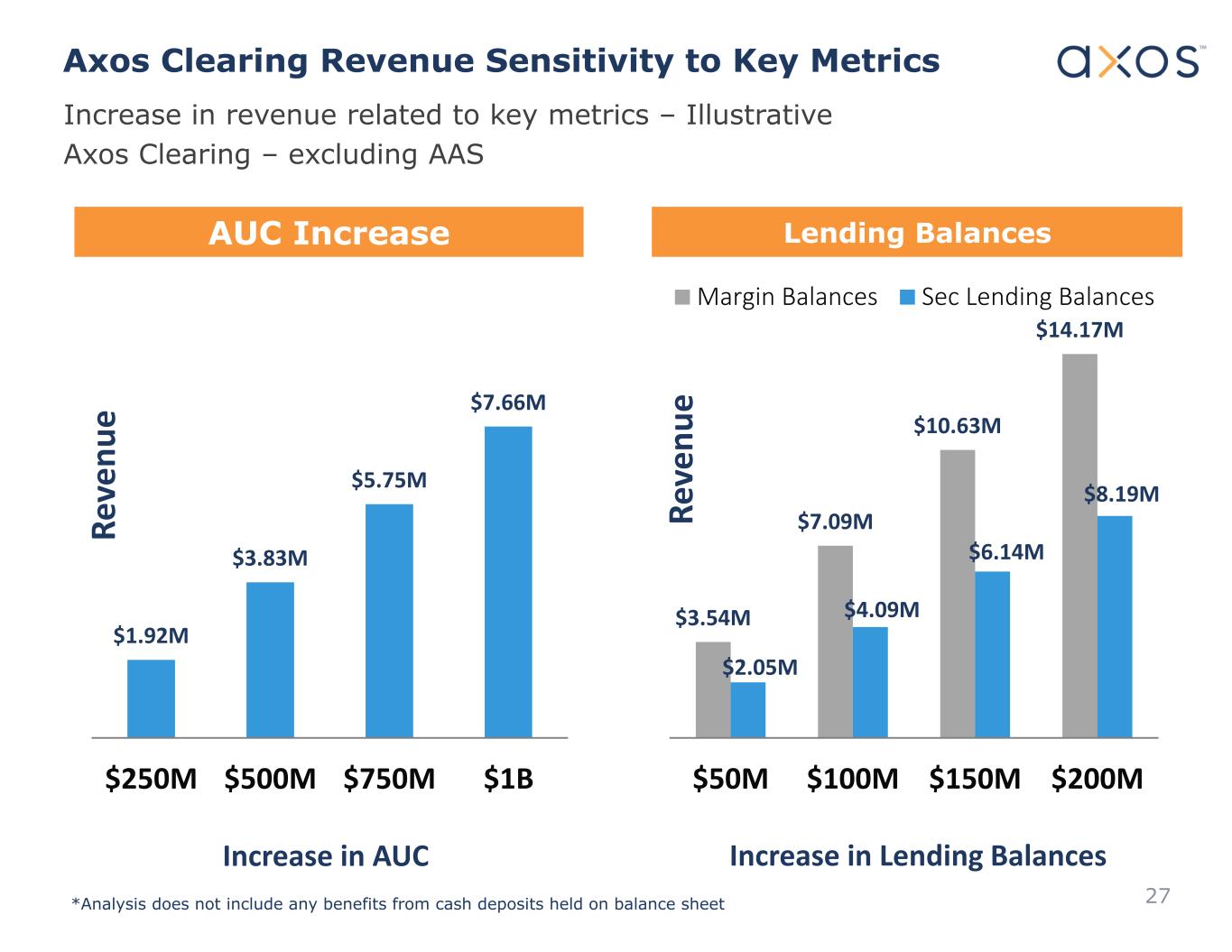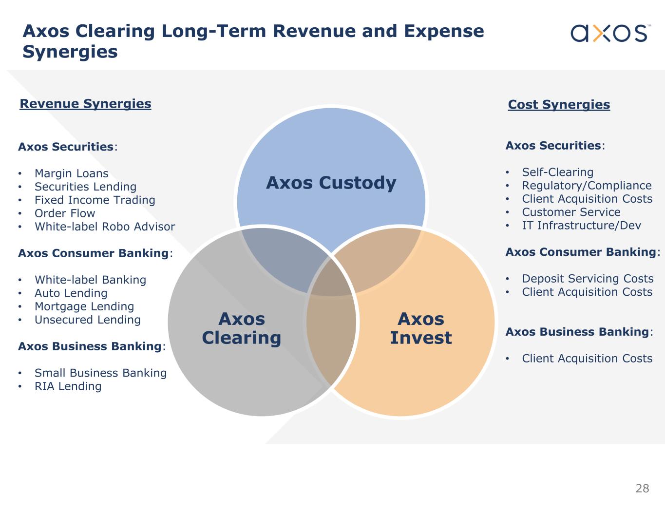 Lending BalancesAUC Increase $1.92M $3.83M $5.75M $7.66M $250M $500M $750M $1B Re ve nu e $3.54M $7.09M $10.63M $14.17M $2.05M $4.09M $6.14M $8.19M $50M $100M $150M $200M Re ve nu e Margin Balances Sec Lending Balances Axos Clearing Revenue Sensitivity to Key Metrics Increase in revenue related to key metrics – Illustrative Axos Clearing – excluding AAS Increase in AUC *Analysis does not include any benefits from cash deposits held on balance sheet Increase in Lending Balances 27