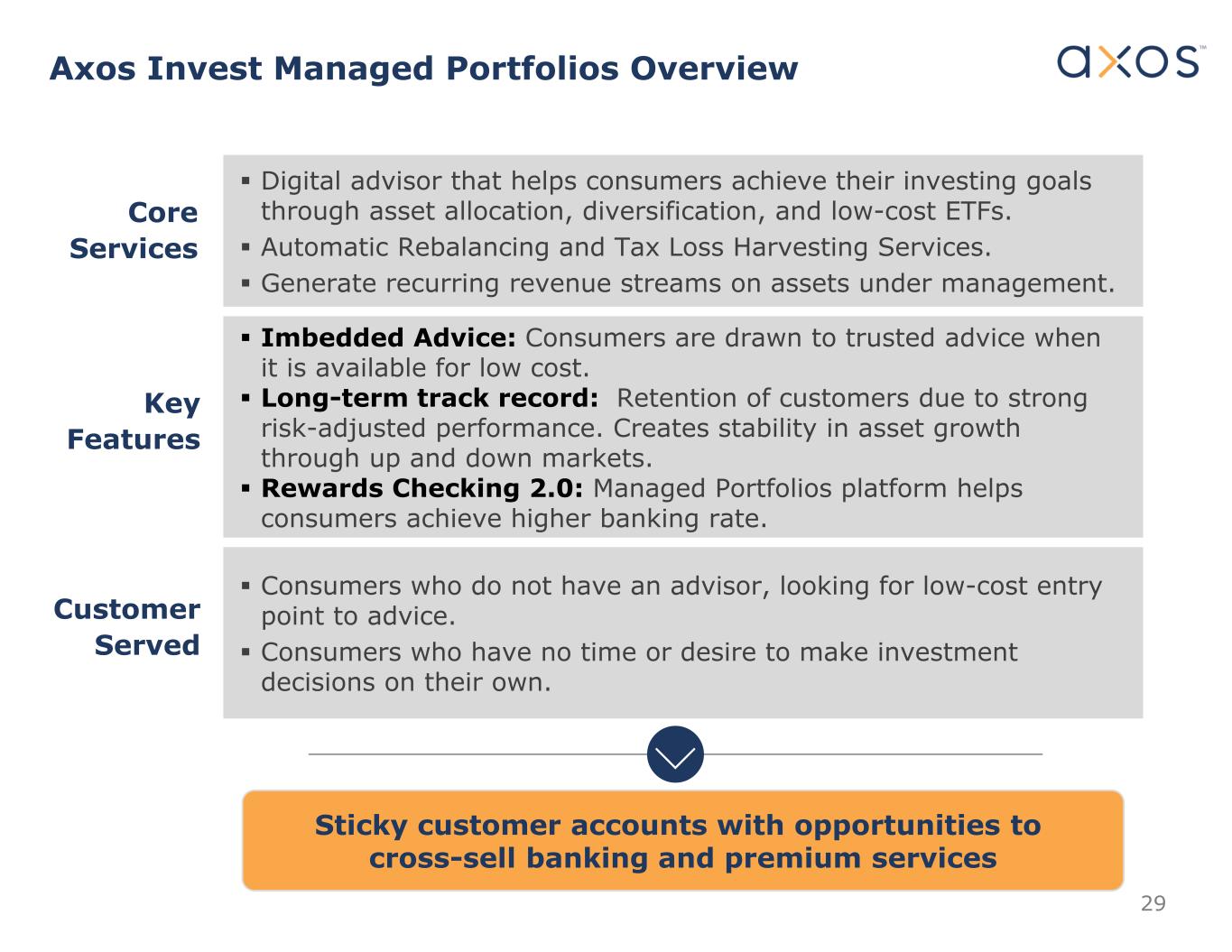 Axos Invest Managed Portfolios Overview  Digital advisor that helps consumers achieve their investing goals through asset allocation, diversification, and low-cost ETFs.  Automatic Rebalancing and Tax Loss Harvesting Services.  Generate recurring revenue streams on assets under management.  Imbedded Advice: Consumers are drawn to trusted advice when it is available for low cost.  Long-term track record: Retention of customers due to strong risk-adjusted performance. Creates stability in asset growth through up and down markets.  Rewards Checking 2.0: Managed Portfolios platform helps consumers achieve higher banking rate.  Consumers who do not have an advisor, looking for low-cost entry point to advice.  Consumers who have no time or desire to make investment decisions on their own. Core Services Customer Served Key Features Sticky customer accounts with opportunities to cross-sell banking and premium services 29
