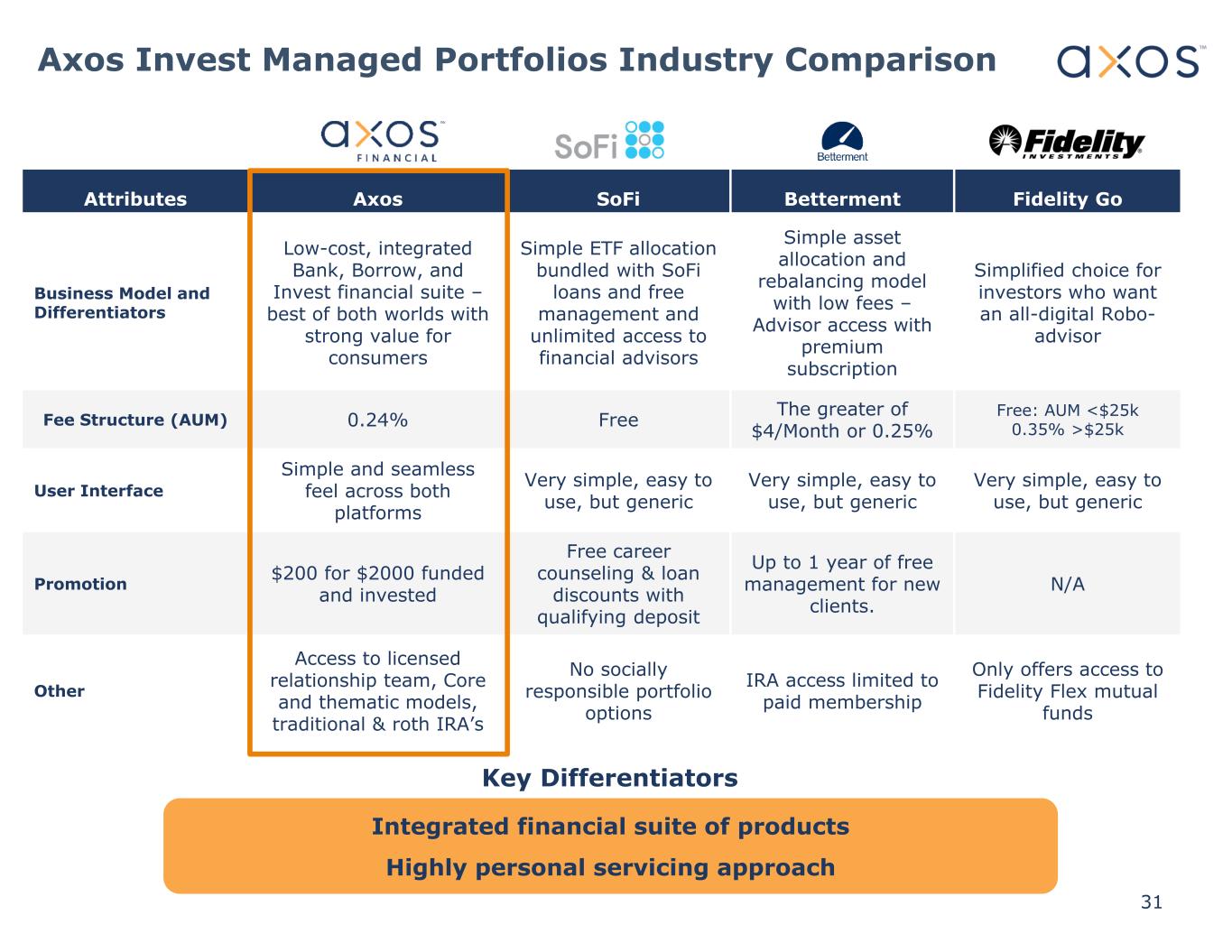 Fidelity GoBettermentSoFiAxosAttributes Simplified choice for investors who want an all-digital Robo- advisor Simple asset allocation and rebalancing model with low fees – Advisor access with premium subscription Simple ETF allocation bundled with SoFi loans and free management and unlimited access to financial advisors Low-cost, integrated Bank, Borrow, and Invest financial suite – best of both worlds with strong value for consumers Business Model and Differentiators Free: AUM <$25k 0.35% >$25k The greater of $4/Month or 0.25%Free0.24%Fee Structure (AUM) Very simple, easy to use, but generic Very simple, easy to use, but generic Very simple, easy to use, but generic Simple and seamless feel across both platforms User Interface N/A Up to 1 year of free management for new clients. Free career counseling & loan discounts with qualifying deposit $200 for $2000 funded and investedPromotion Only offers access to Fidelity Flex mutual funds IRA access limited to paid membership No socially responsible portfolio options Access to licensed relationship team, Core and thematic models, traditional & roth IRA’s Other Axos Invest Managed Portfolios Industry Comparison Integrated financial suite of products Highly personal servicing approach Key Differentiators 31