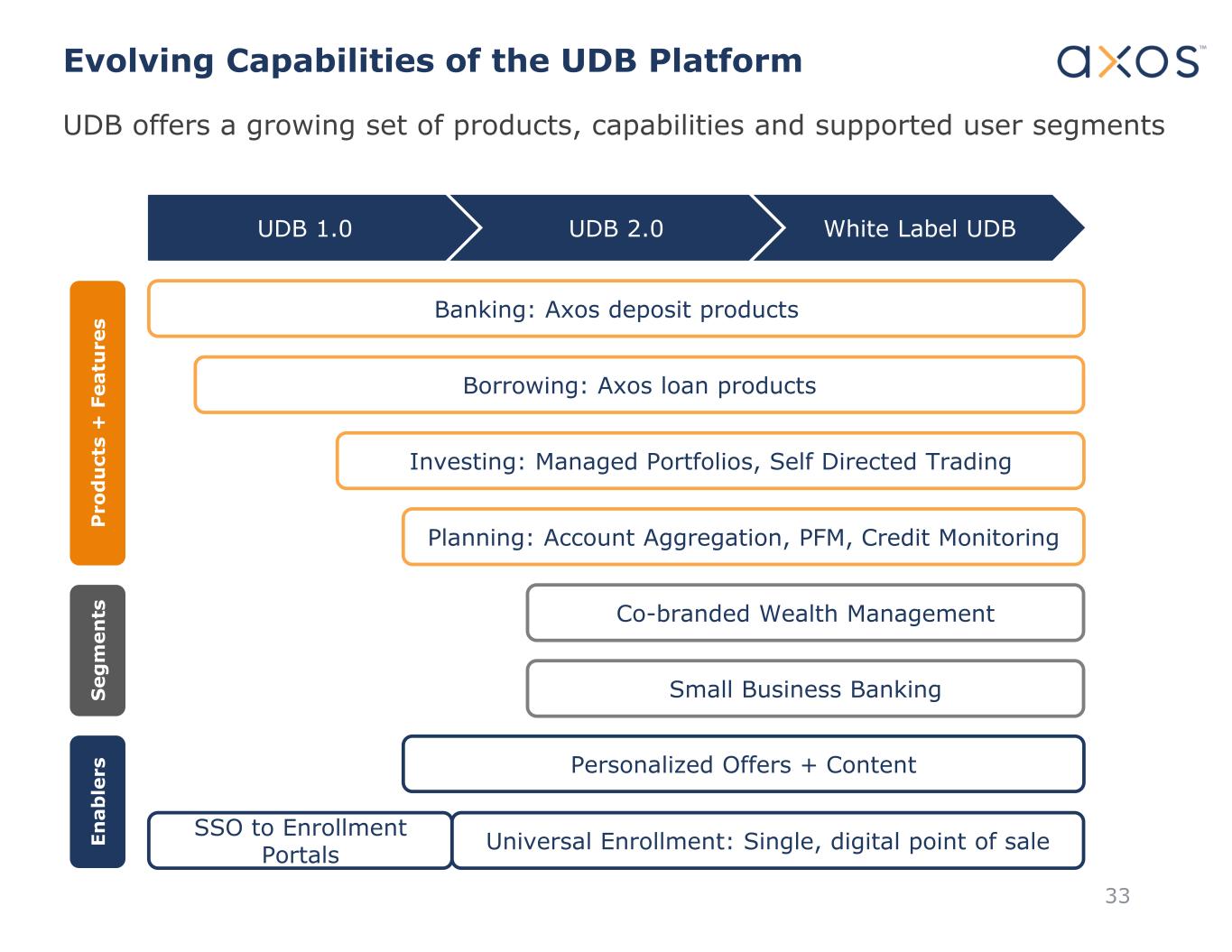 Evolving Capabilities of the UDB Platform UDB 1.0 UDB 2.0 White Label UDB Banking: Axos deposit products Borrowing: Axos loan products Investing: Managed Portfolios, Self Directed Trading Planning: Account Aggregation, PFM, Credit Monitoring Personalized Offers + Content Co-branded Wealth Management SSO to Enrollment Portals Universal Enrollment: Single, digital point of sale UDB offers a growing set of products, capabilities and supported user segments Small Business Banking P ro d u ct s + F ea tu re s S eg m en ts En ab le rs 33