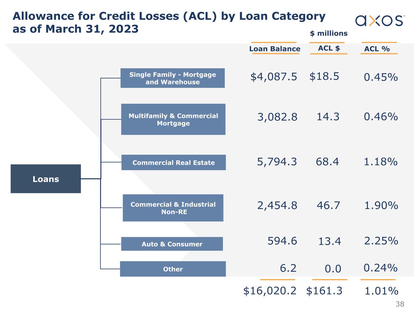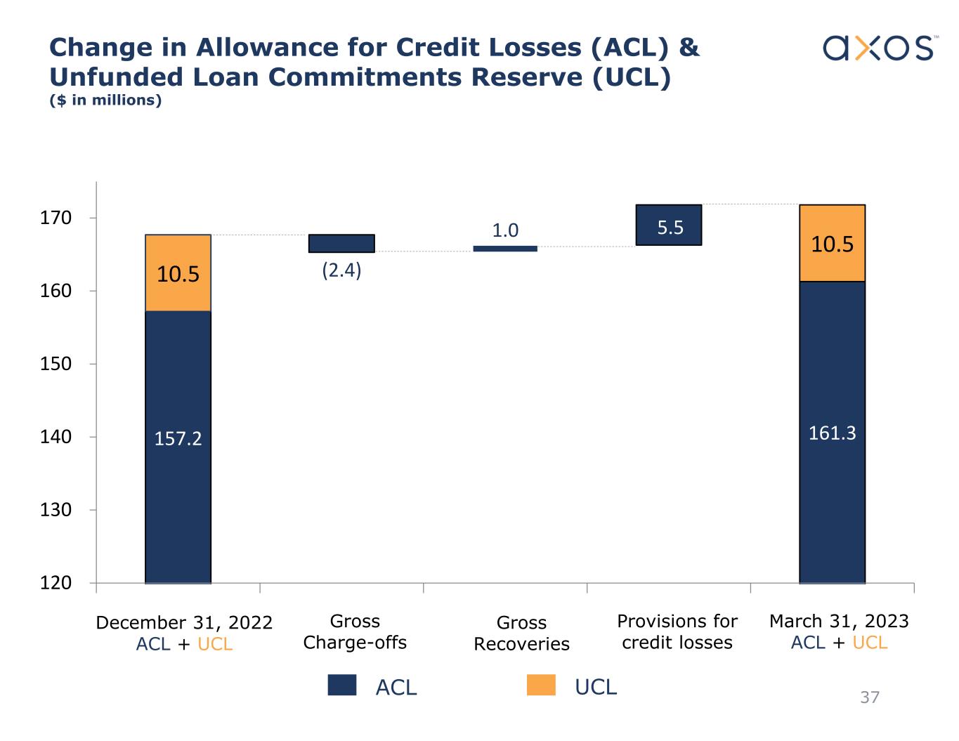 Change in Allowance for Credit Losses (ACL) & Unfunded Loan Commitments Reserve (UCL) ($ in millions) 157.2 (2.4) 1.0 5.5 161.3 10.5 10.5 120 130 140 150 160 170 December 31, 2022 ACL + UCL Gross Charge-offs Provisions for credit losses Gross Recoveries March 31, 2023 ACL + UCL UCLACL 37