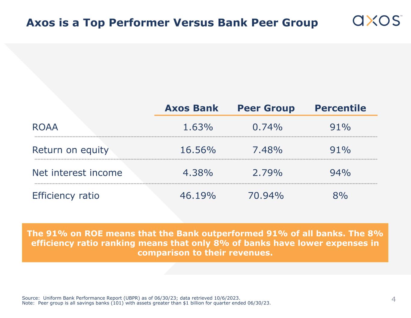 Axos is a Top Performer Versus Bank Peer Group 4 PercentilePeer GroupAxos Bank 91%0.74%1.63%ROAA 91%7.48%16.56%Return on equity 94%2.79%4.38%Net interest income 8%70.94%46.19%Efficiency ratio Source: Uniform Bank Performance Report (UBPR) as of 06/30/23; data retrieved 10/6/2023. Note: Peer group is all savings banks (101) with assets greater than $1 billion for quarter ended 06/30/23. The 91% on ROE means that the Bank outperformed 91% of all banks. The 8% efficiency ratio ranking means that only 8% of banks have lower expenses in comparison to their revenues.
