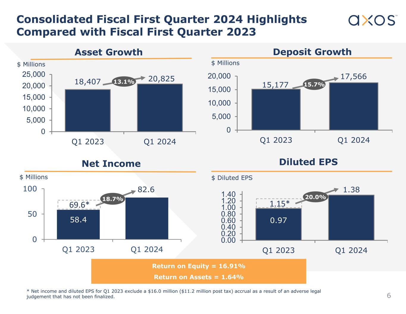5 Consumer Banking Commercial BankingSecurities Axos Financial’s Three Divisions Provide the Foundation for Sustained Long-term Growth › Diverse mix of asset, deposit, and fee income reduces risk and provides multiple growth opportunities in varying environments › Differentiated retail digital strategy from “online savings banks” or fin-tech competitors › Structural cost advantage vs. traditional banks › Differentiated distribution strategy › New business initiatives generate incremental growth › Universal Digital Banking Platform and Enterprise Technology stack provide operating leverage opportunity › Technology synergies among divisions reduce overall cost of growth strategy Investment Thesis