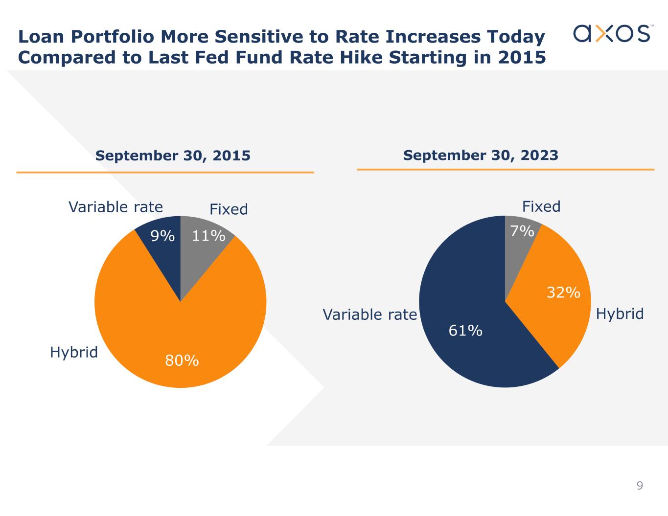 Loan Portfolio More Sensitive to Rate Increases Today Compared to Last Fed Fund Rate Hike Starting in 2015 September 30, 2015 September 30, 2023 11% 80% 9% Fixed Hybrid Variable rate 7% 32% 61% Fixed HybridVariable rate 9