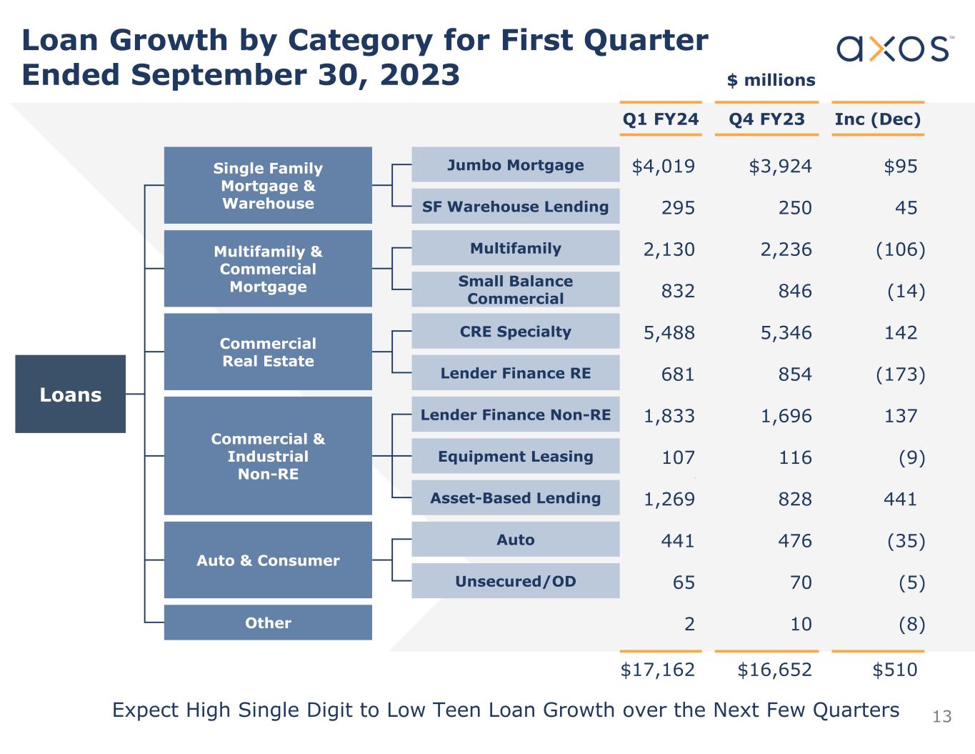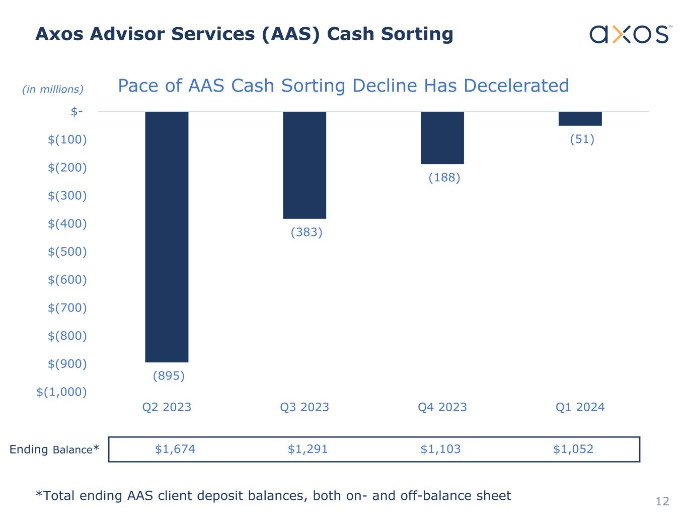 Axos Advisor Services (AAS) Cash Sorting 12 Ending Balance* *Total ending AAS client deposit balances, both on- and off-balance sheet (895) (383) (188) (51) $(1,000) $(900) $(800) $(700) $(600) $(500) $(400) $(300) $(200) $(100) $- Q2 2023 Q3 2023 Q4 2023 Q1 2024 Pace of AAS Cash Sorting Decline Has Decelerated $1,052$1,103$1,291$1,674 (in millions)