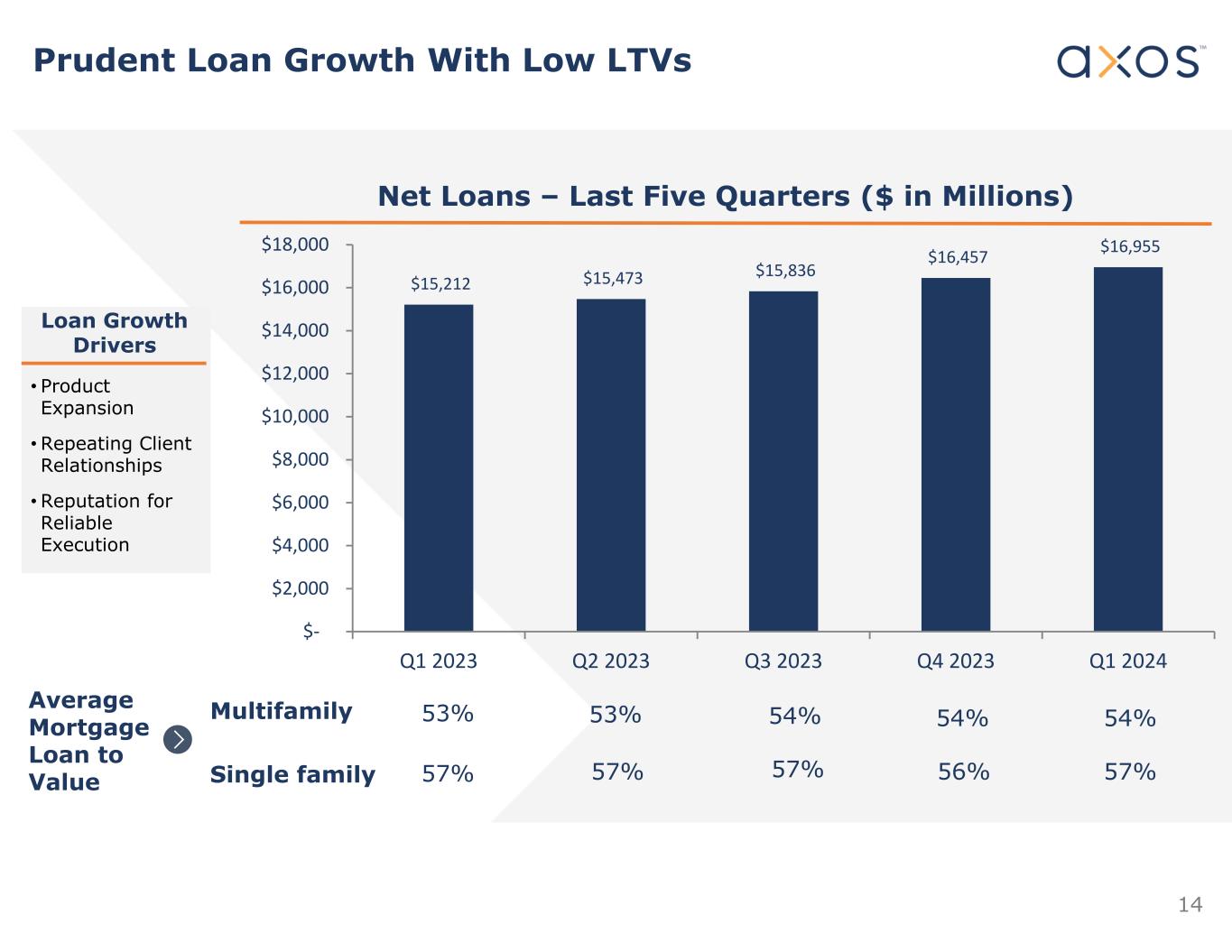 13 Loan Growth by Category for First Quarter Ended September 30, 2023 $ millions Inc (Dec)Q4 FY23Q1 FY24 $95$3,924$4,019 45250295 )(1062,2362,130 )(14846832 1425,3465,488 )(173854681 1371,6961,833 )(9116107 ) 4418281,269 )(35476441 )(57065 )(8102 $510$16,652$17,162 Jumbo Mortgage SF Warehouse Lending Multifamily Small Balance Commercial CRE Specialty Lender Finance RE Lender Finance Non-RE Equipment Leasing Asset-Based Lending Auto Unsecured/OD Single Family Mortgage & Warehouse Multifamily & Commercial Mortgage Commercial Real Estate Commercial & Industrial Non-RE Auto & Consumer Other Loans Expect High Single Digit to Low Teen Loan Growth over the Next Few Quarters