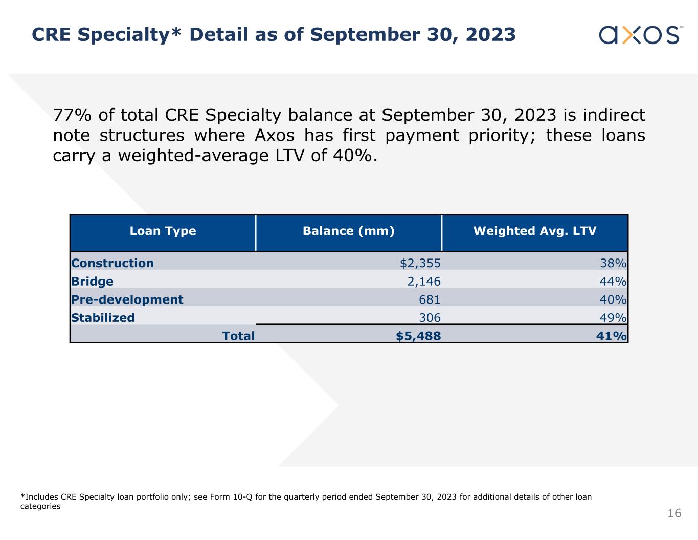 15 CRE Specialty* Detail as of September 30, 2023 Non-Performing Loans (mm)Weighted Avg. LTVBalance (mm)Loan Type $1143%$1,804Multifamily 15371,109SFR 0411,061Hotel 039496Industrial 038456Office 043226Retail 041336Other $2641%$5,488Total <=50% > 50% to 60% >60% to 65% > 65% 81% 16% 2% 1% LTV Distribution *Includes CRE Specialty loan portfolio only; see Form 10-Q for the quarterly period ended September 30, 2023 for additional details of other loan categories