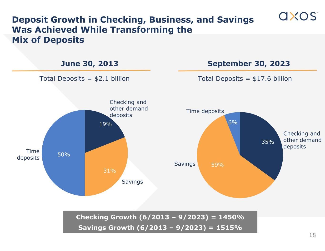 17 Consumer  Direct Distribution  Partners Small Business  Banking Commercial /  Treasury  Management Axos Securities Specialty  Deposits Fiduciary  Services Diversified Deposit Gathering Business Lines $1.1 B $1.1 B $10.1 B $0.6 B $0.3 B $3.4 B $1.0 B Diversified Deposit Gathering Approximately 90% of deposits are FDIC-insured or collateralized *Deposit balances as of 9/30/23 1Excludes approximately $550 million of off-balance sheet deposits 2Excludes approximately $750 million of client deposits held at other banks 1 2 › Full service digital banking, wealth management, and securities trading › White-label banking › Business banking with simple suite of cash management services › Serves approximately 40% of U.S. Chapter 7 bankruptcy trustees in exclusive relationship › Software allows servicing of SEC receivers and non-chapter 7 cases › 1031 exchange firms › Title and escrow companies › HOA and property management › Business management and entertainment › Broker-dealer client cash › Broker-dealer reserve accounts › Full service treasury/cash management › Team enhancements and geographic expansion › Bank and securities cross-sell