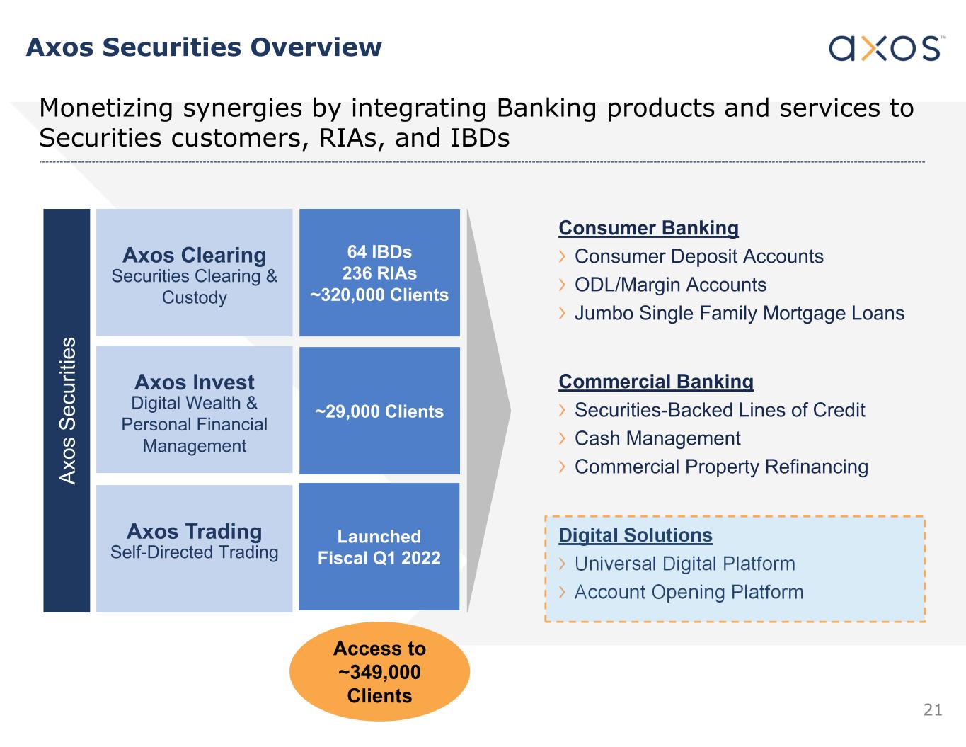 21 Axos Clearing Securities Clearing & Custody Axos Invest Digital Wealth & Personal Financial Management Axos Trading Self-Directed Trading Ax os S ec ur iti es 64 IBDs 236 RIAs ~320,000 Clients ~29,000 Clients Launched Fiscal Q1 2022 Consumer Banking Consumer Deposit Accounts ODL/Margin Accounts Jumbo Single Family Mortgage Loans Commercial Banking Securities-Backed Lines of Credit Cash Management Commercial Property Refinancing Digital Solutions Universal Digital Platform Account Opening Platform Access to ~349,000 Clients Monetizing synergies by integrating Banking products and services to Securities customers, RIAs, and IBDs .  Axos Securities Overview