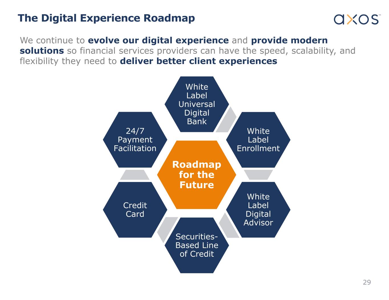 Evolving Capabilities of the UDB Platform UDB 1.0 UDB 2.0 White Label UDB Banking: Axos deposit products Borrowing: Axos loan products Investing: Managed Portfolios, Self Directed Trading Planning: Account Aggregation, PFM, Credit Monitoring Personalized Offers + Content Co-branded Wealth Management SSO to Enrollment Portals Universal Enrollment: Single, digital point of sale UDB offers a growing set of products, capabilities and supported user segments Small Business Banking P ro d u ct s + F ea tu re s S eg m en ts En ab le rs 28