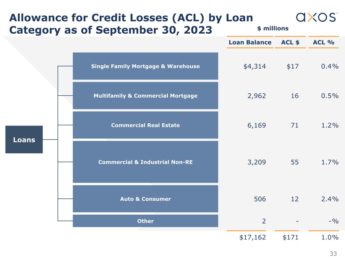 Change in Allowance for Credit Losses (ACL) & Unfunded Loan Commitments Reserve (UCL) ($ in millions) 166.7 2.4 0.8 5.8 170.9 10.5 11.7 130 140 150 160 170 180 190 1.2 June 30, 2023 ACL + UCL Gross Charge-offs Provisions for credit losses Gross Recoveries September 30, 2023 ACL + UCL UCLACL 32