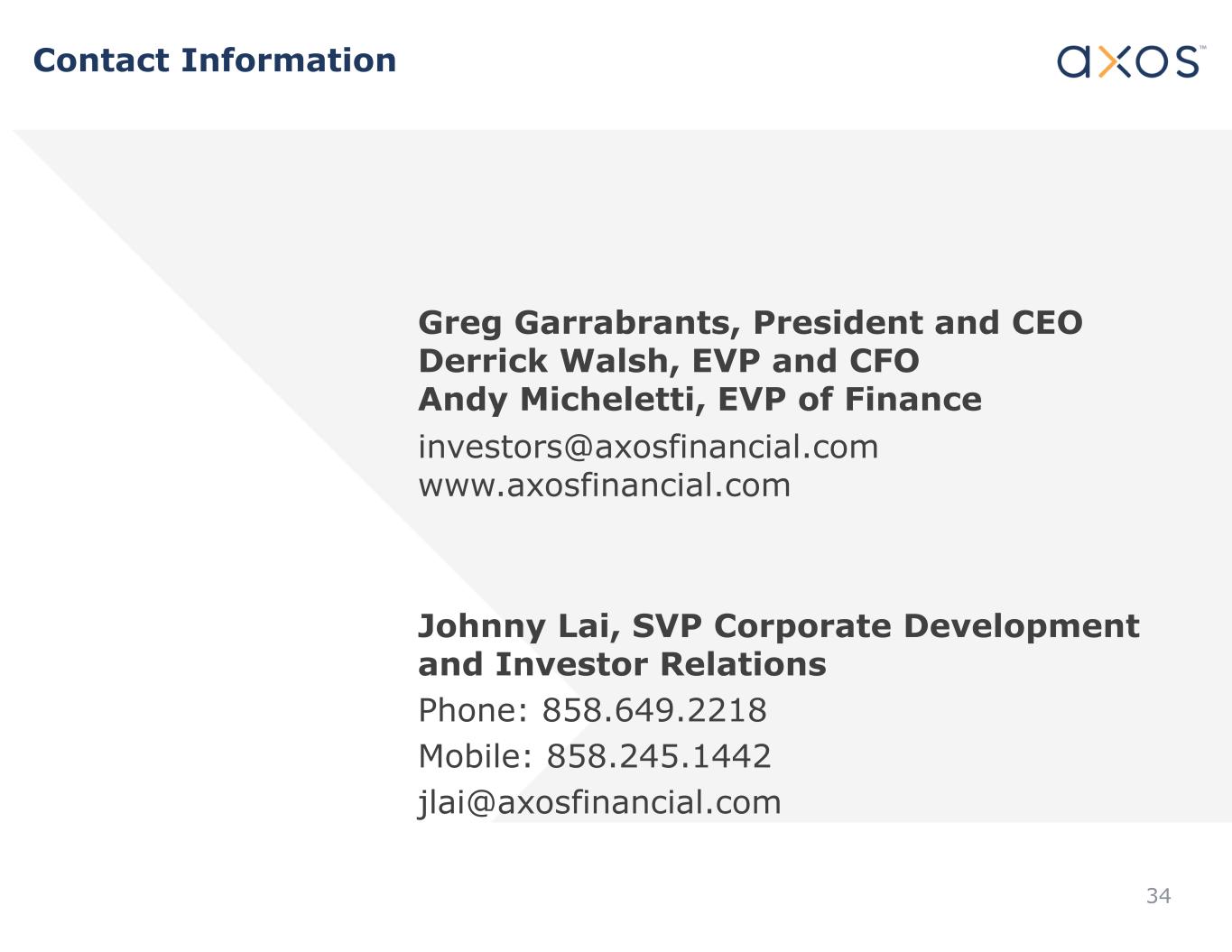 Contact Information Greg Garrabrants, President and CEO Derrick Walsh, EVP and CFO Andy Micheletti, EVP of Finance investors@axosfinancial.com www.axosfinancial.com Johnny Lai, SVP Corporate Development and Investor Relations Phone: 858.649.2218 Mobile: 858.245.1442 jlai@axosfinancial.com 34