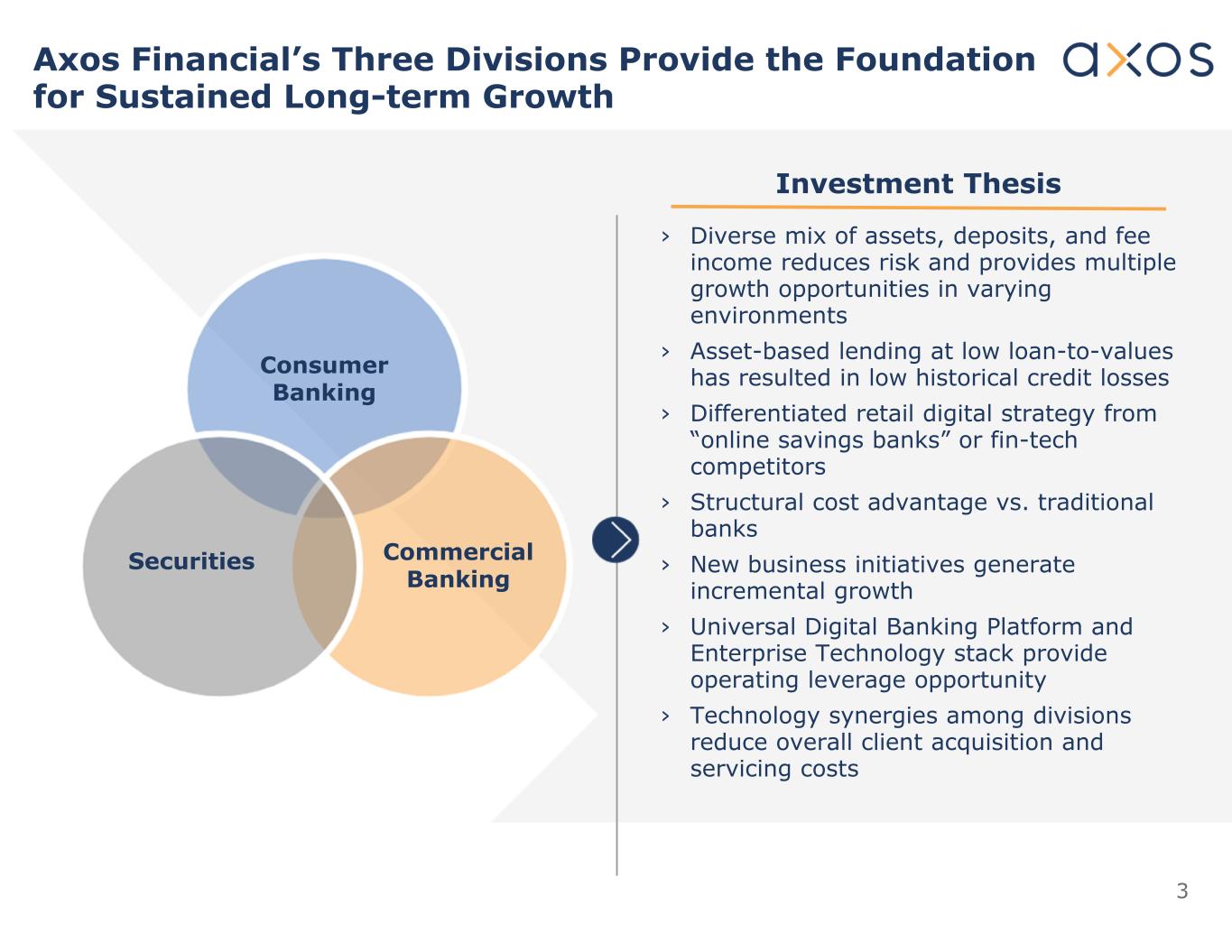 2 Safe Harbor This presentation contains forward-looking statements that involve risks and uncertainties, including without limitation statements relating to Axos Financial, Inc.’s (“Axos”) financial prospects and other projections of its performance and asset quality, Axos’ deposit balances and capital ratios, Axos’ ability to continue to grow profitably and increase its business, Axos’ ability to continue to diversify its lending and deposit franchises, the anticipated timing and financial performance of other offerings, initiatives, and acquisitions, expectations of the environment in which Axos operates and projections of future performance. These forward- looking statements are made on the basis of the views and assumptions of management regarding future events and performance as of the date of this presentation. Actual results and the timing of events could differ materially from those expressed or implied in such forward-looking statements as a result of risks and uncertainties, including without limitation Axos’ ability to successfully integrate acquisitions and realize the anticipated benefits of the transactions, changes in the interest rate environment, monetary policy, inflation, government regulation, general economic conditions, changes in the competitive marketplace, conditions in the real estate markets in which we operate, risks associated with credit quality, our ability to attract and retain deposits and access other sources of liquidity, and the outcome and effects of litigation and other factors beyond our control. These and other risks and uncertainties detailed in Axos’ periodic reports filed with the Securities and Exchange Commission, including its Annual Report on Form 10-K for the fiscal year ended June 30, 2023, as supplemented by its Quarterly Reports on Form 10-Q, could cause actual results to differ materially from those expressed or implied in any forward-looking statements. Readers are cautioned not to place undue reliance on these forward-looking statements, which speak only as of the date of this press release. Axos undertakes no obligation to publicly update or revise any forward-looking statements, whether as a result of new information, future events or otherwise. All written and oral forward-looking statements made in connection with this presentation, which are attributable to us or persons acting on Axos’ behalf are expressly qualified in their entirety by the foregoing information.