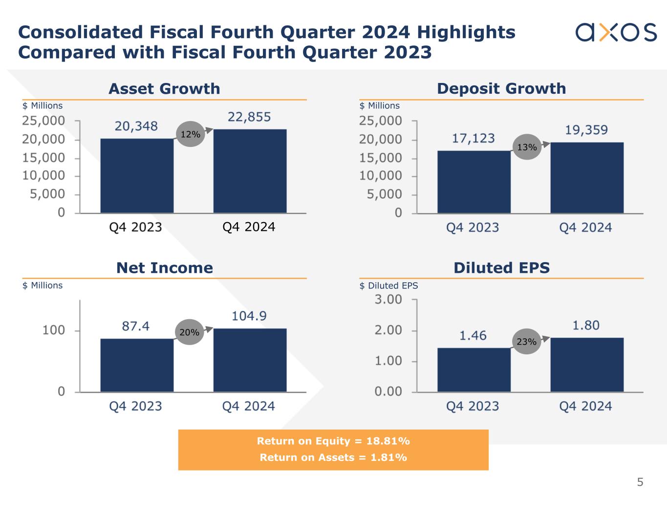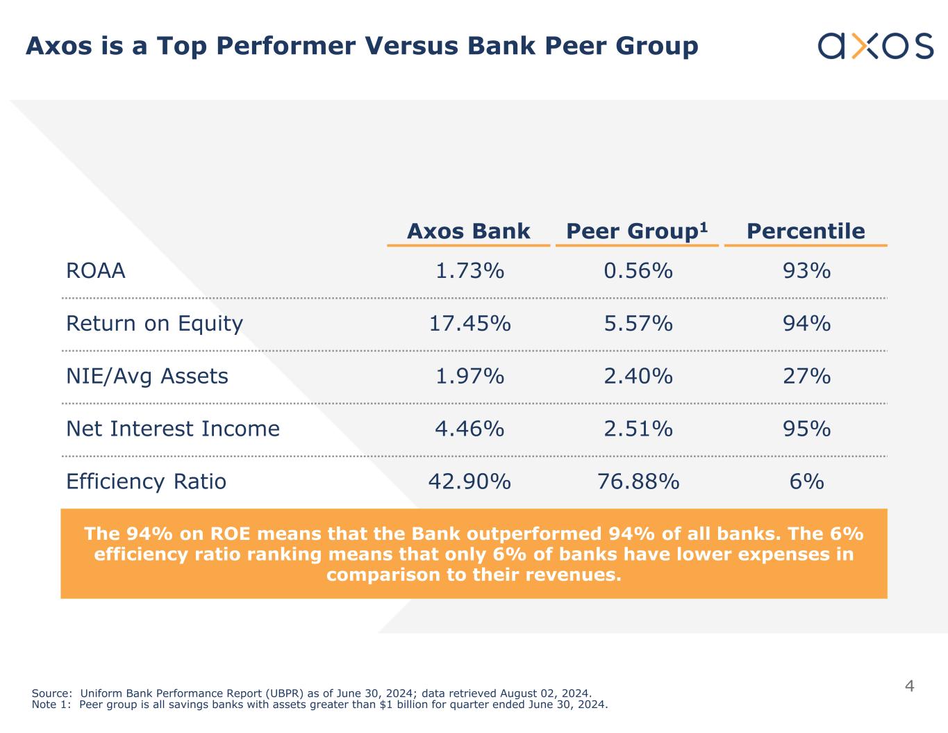 4 PercentilePeer Group1Axos Bank 93%0.56%1.73%ROAA 94%5.57%17.45%Return on Equity 27%2.40%1.97%NIE/Avg Assets 95%2.51%4.46%Net Interest Income 6%76.88%42.90%Efficiency Ratio Source: Uniform Bank Performance Report (UBPR) as of June 30, 2024; data retrieved August 02, 2024. Note 1: Peer group is all savings banks with assets greater than $1 billion for quarter ended June 30, 2024. The 94% on ROE means that the Bank outperformed 94% of all banks. The 6% efficiency ratio ranking means that only 6% of banks have lower expenses in comparison to their revenues. Axos is a Top Performer Versus Bank Peer Group