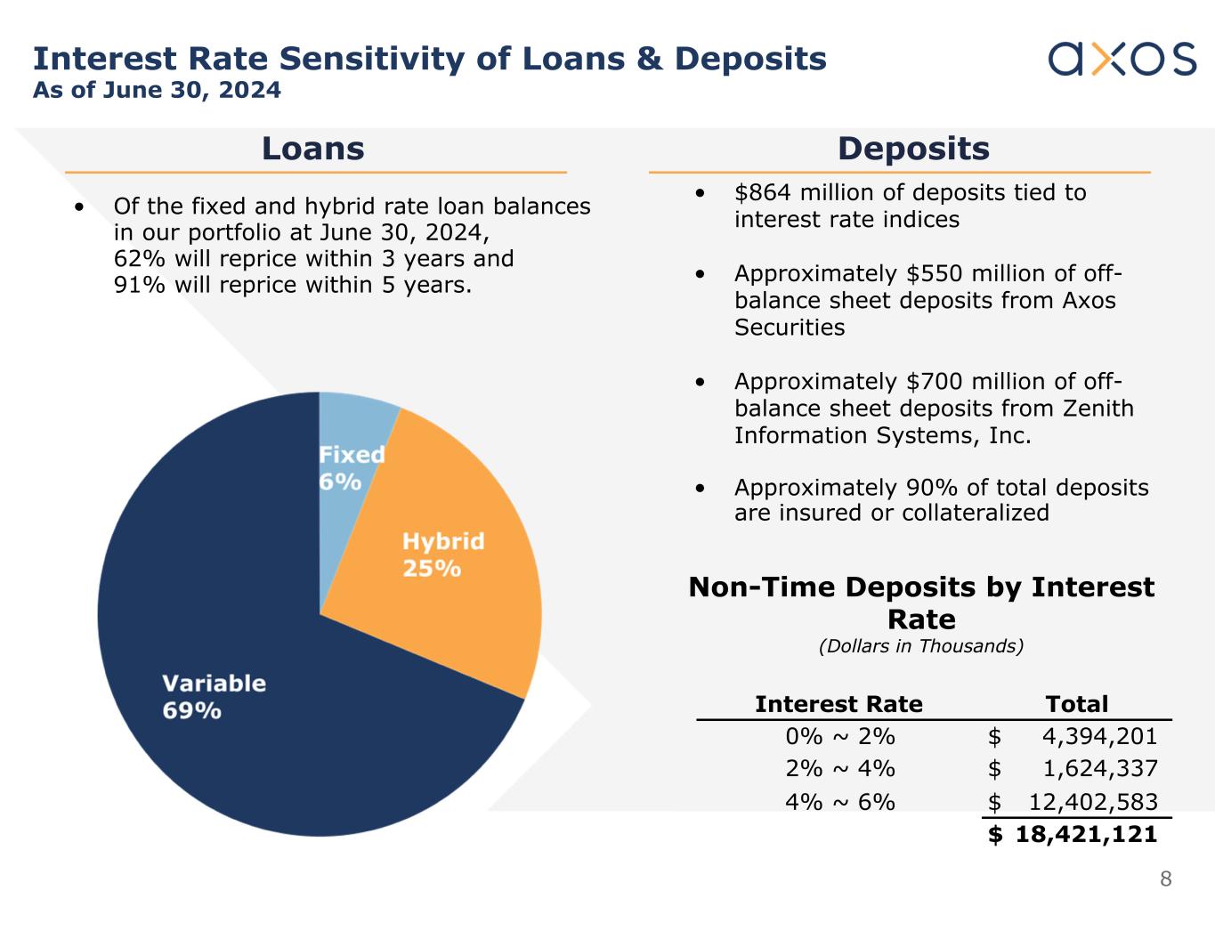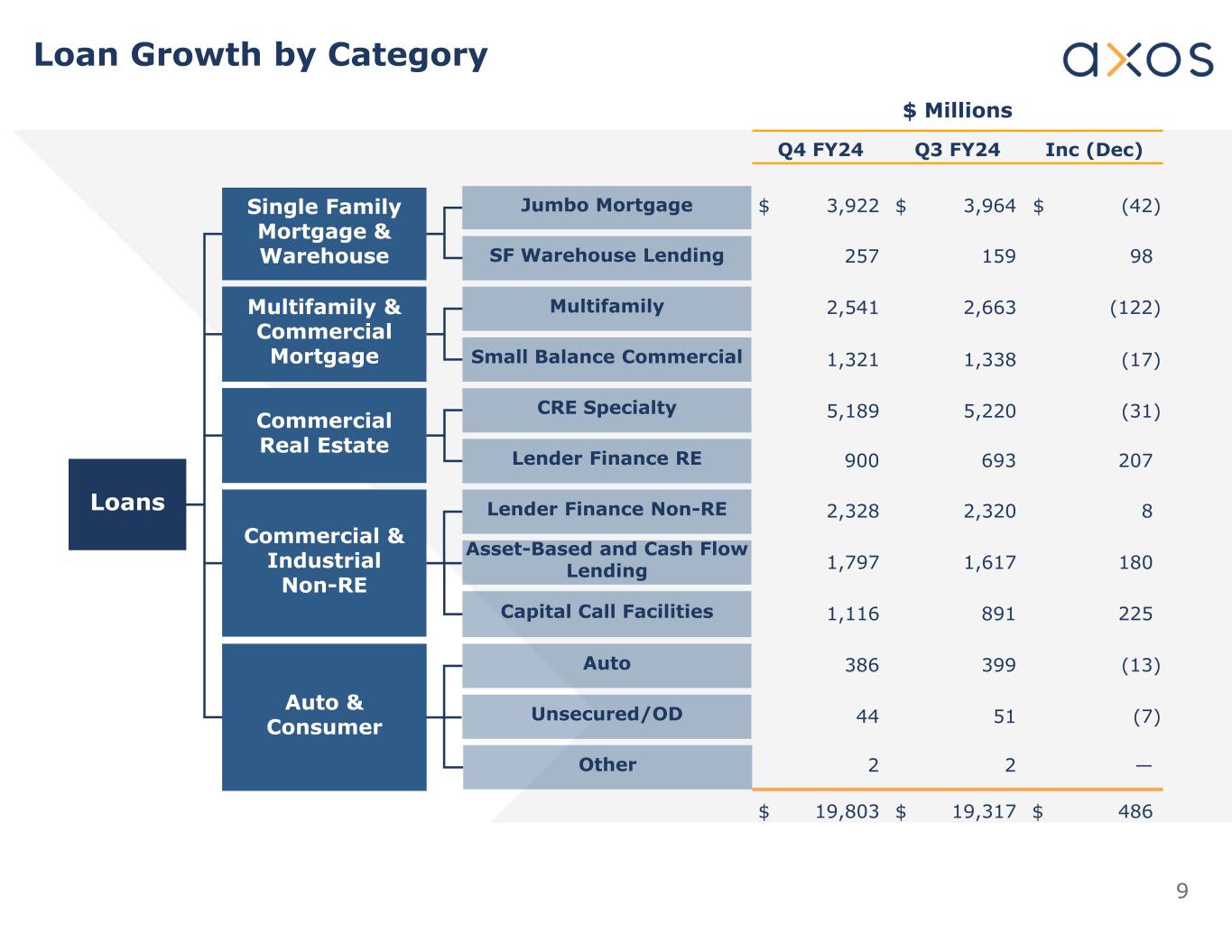 8 DepositsLoans Interest Rate Sensitivity of Loans & Deposits As of June 30, 2024 TotalInterest Rate $ 4,394,2010% ~ 2% $ 1,624,3372% ~ 4% $ 12,402,5834% ~ 6% $ 18,421,121 Non-Time Deposits by Interest Rate (Dollars in Thousands) • $864 million of deposits tied to interest rate indices • Approximately $550 million of off- balance sheet deposits from Axos Securities • Approximately $700 million of off- balance sheet deposits from Zenith Information Systems, Inc. • Approximately 90% of total deposits are insured or collateralized • Of the fixed and hybrid rate loan balances in our portfolio at June 30, 2024, 62% will reprice within 3 years and 91% will reprice within 5 years.