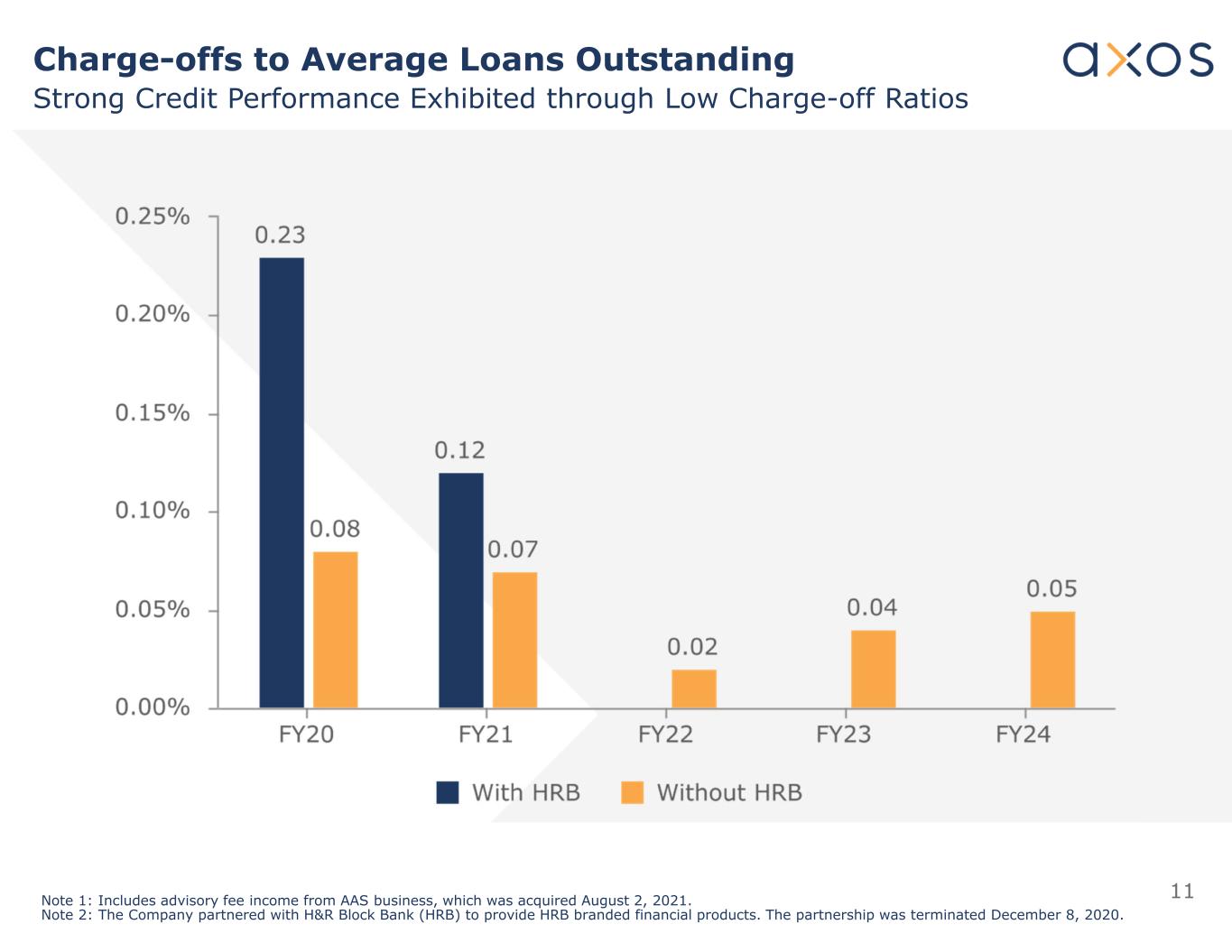 10 Holistic Credit Risk Management What We Do Loan Life Cycle Utilize a holistic credit-risk management framework to manage and monitor credit quality at each stage of the loan life cycle, and leverage specialized Credit Tools to optimize monitoring and reporting capabilities Set Appetite Originations Portfolio Management Reporting Special Assets Credit Monitoring & Oversight Axos Credit Objectives Example of Credit Tools › Board of Directors › Annual Strategic Plan › Corporate Governance › Policies & Approval Authorities Note: Credit Tools list is a sampling and is not purported to be comprehensive.     Establish Credit Framework and Culture Safe Growth Monitor Assets Throughout Life Cycle Data-Driven Decision Making Mitigate Problem Loans