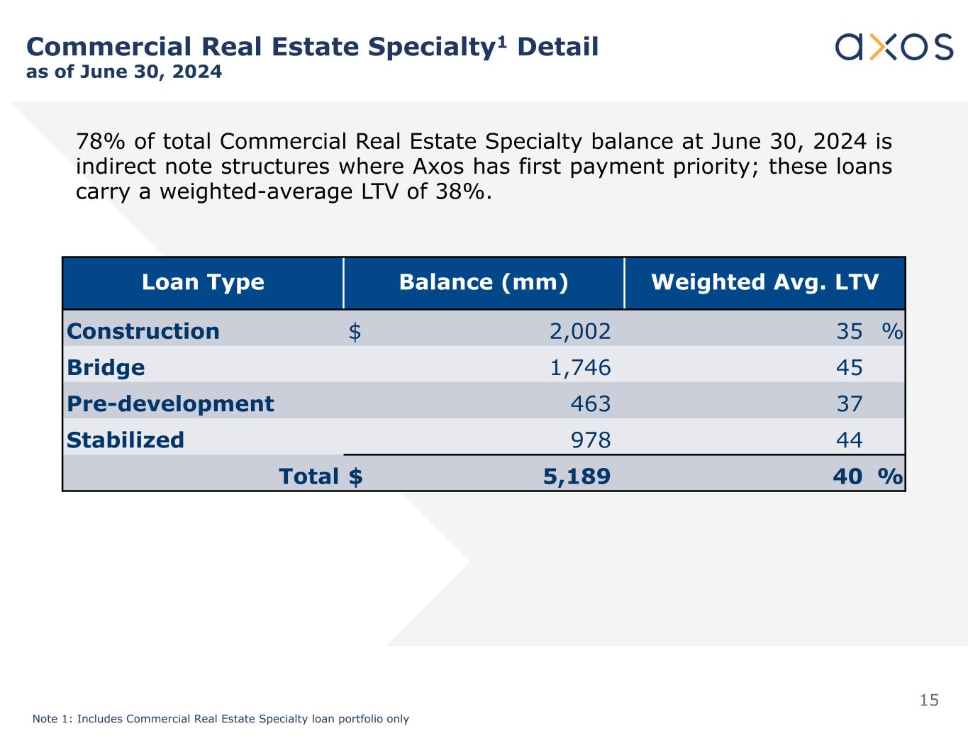 14 Commercial Real Estate Specialty1 Detail as of June 30, 2024 Non-Accrual Loans (mm)Weighted Avg. LTVBalance (mm)Loan Type $ 1139 %$ 1,946Multifamily —401,021Hotel 1543710SFR —48536Industrial —32451Other —35302Office —46223Retail $ 2640 %$ 5,189Total LTV Distribution Note 1: Includes Commercial Real Estate Specialty loan portfolio only.