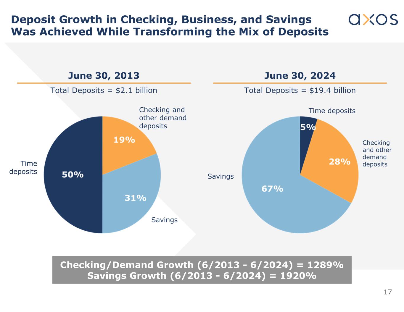 16 Diversified Deposit Gathering Approximately 90% of deposits are FDIC-insured or collateralized Deposit balances as of June 30, 2024 Note 1: Excludes approximately $550 million of off-balance sheet deposits Note 2: Excludes approximately $700 million of client deposits held at other banks › Serves approximately 40% of U.S. Chapter 7 bankruptcy trustees in exclusive relationship › Software allows servicing of SEC receivers and non-chapter 7 cases › Full service digital banking, wealth management, and securities trading › White-label banking › Business banking with simple suite of cash management services › HOA and property management › Business management and entertainment › Title and escrow companies › 1031 exchange firms › Broker-dealer client cash › Broker-dealer reserve accounts › Full service treasury/cash management › Team enhancements and geographic expansion › Bank and securities cross-sell Fiduciary Services $1.1B Consumer Direct $11.6B Specialty Deposits $1.5B2 Distribution Partners $0.5B Axos Securities $0.8B1 Small Business Banking $0.4B Commercial & Treasury Management $3.5B Diversified Deposit Gathering Business Lines