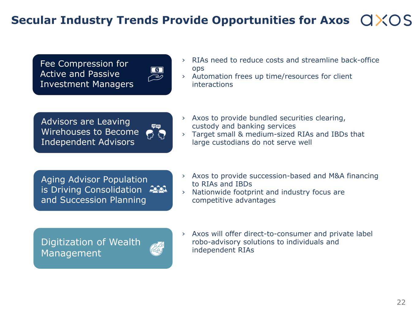 21 Axos Advisor Services (AAS) At A Glance Liberty Provides a Comprehensive Turnkey Platform Automatic Reconciliation Serving 205 RIAs1,3 ($1M+ AUC) ~$26B Assets Under Custody2 Small RIAs 3% of Total AUC3 Advisors with <$25M in AUC Traditional RIAs 38% of Total AUC3 Gathers and manages assets, works directly with investor TAMPs 59% of Total AUC3 Turnkey Asset Management Platform, relies on Reps to gather assets and maintain relationship with investor Data as of June 30, 2024 Note 1: 231 total advisors on Liberty platform; advisors with <$1M AUC comprise <$10M in total assets; there are 9 non-AAS RIAs not on Liberty at Axos Clearing Note 2: Includes $189M 401K AUC Note 3: Excludes $189M 401K AUC