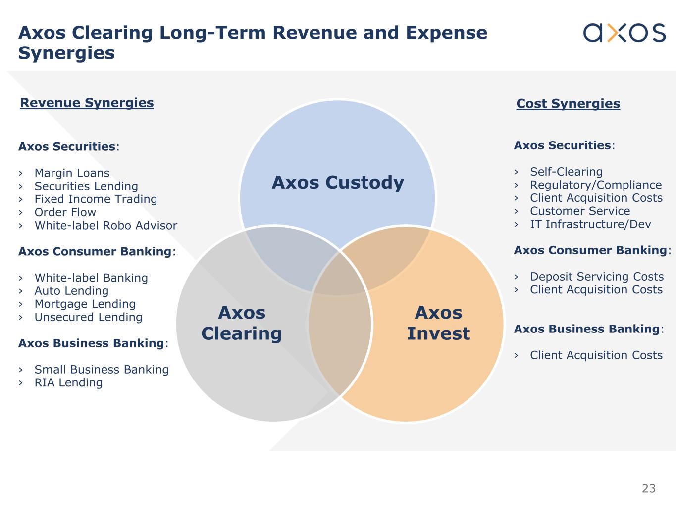 22 Secular Industry Trends Provide Opportunities for Axos › RIAs need to reduce costs and streamline back-office ops › Automation frees up time/resources for client interactions › Axos to provide bundled securities clearing, custody and banking services › Target small & medium-sized RIAs and IBDs that large custodians do not serve well › Axos to provide succession-based and M&A financing to RIAs and IBDs › Nationwide footprint and industry focus are competitive advantages › Axos will offer direct-to-consumer and private label robo-advisory solutions to individuals and independent RIAs Fee Compression for Active and Passive Investment Managers Digitization of Wealth Management Aging Advisor Population is Driving Consolidation and Succession Planning Advisors are Leaving Wirehouses to Become Independent Advisors