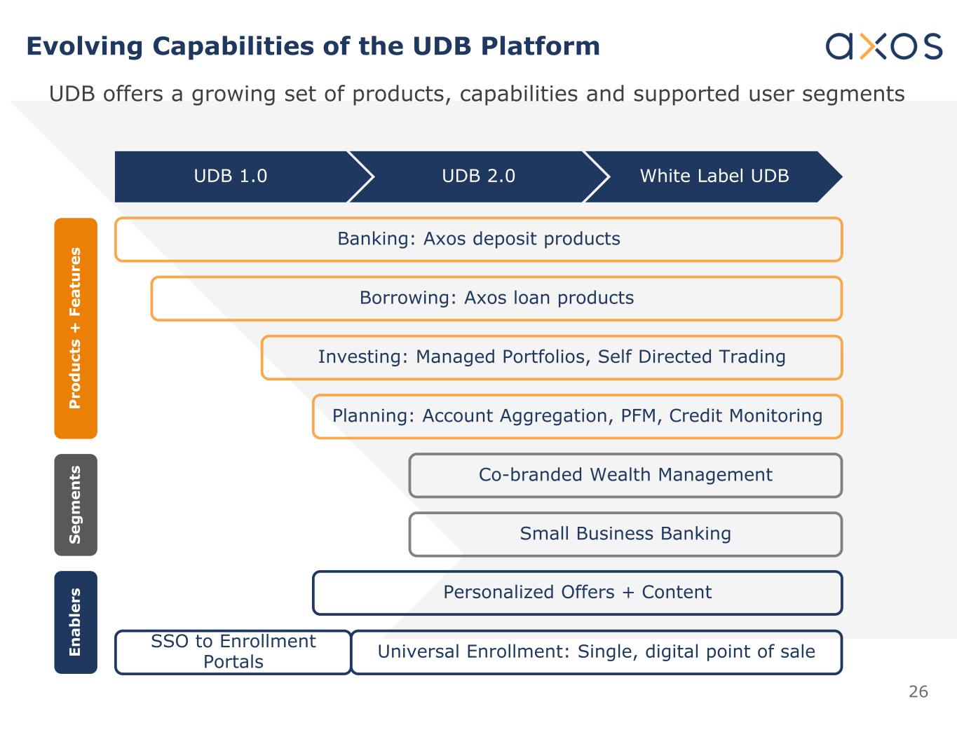 26 Evolving Capabilities of the UDB Platform UDB 1.0 UDB 2.0 White Label UDB Banking: Axos deposit products Borrowing: Axos loan products Investing: Managed Portfolios, Self Directed Trading Planning: Account Aggregation, PFM, Credit Monitoring Personalized Offers + Content Co-branded Wealth Management SSO to Enrollment Portals Universal Enrollment: Single, digital point of sale UDB offers a growing set of products, capabilities and supported user segments Small Business Banking P ro d u ct s + F ea tu re s S eg m en ts En ab le rs