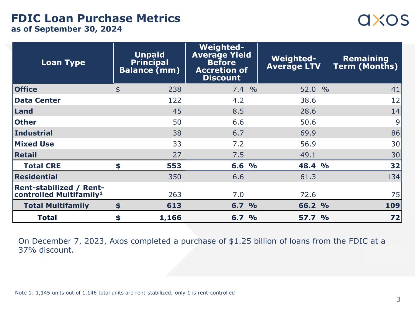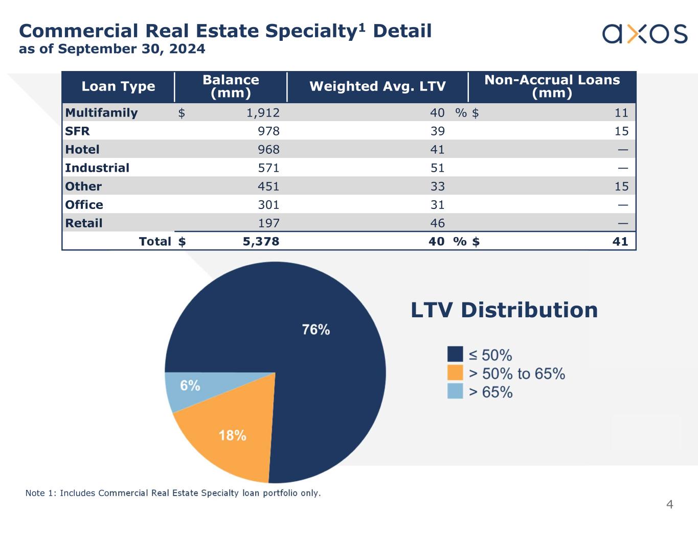 3 FDIC Loan Purchase Metrics as of September 30, 2024 Remaining Term (Months) Weighted- Average LTV Weighted- Average Yield Before Accretion of Discount Unpaid Principal Balance (mm) Loan Type 4152.0 %7.4 %$ 238Office 1238.64.2122Data Center 1428.68.545Land 950.66.650Other 8669.96.738Industrial 3056.97.233Mixed Use 3049.17.527Retail 3248.4 %6.6 %$ 553Total CRE 13461.36.6350Residential 7572.67.0263 Rent-stabilized / Rent- controlled Multifamily1 10966.2 %6.7 %$ 613Total Multifamily 7257.7 %6.7 %$ 1,166Total Note 1: 1,145 units out of 1,146 total units are rent-stabilized; only 1 is rent-controlled On December 7, 2023, Axos completed a purchase of $1.25 billion of loans from the FDIC at a 37% discount.