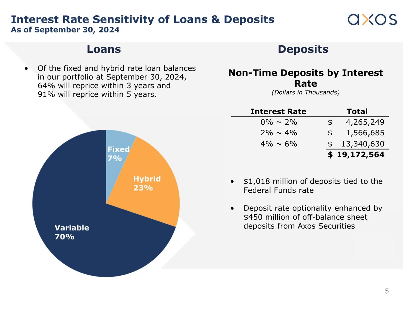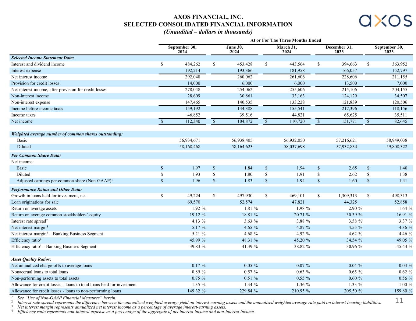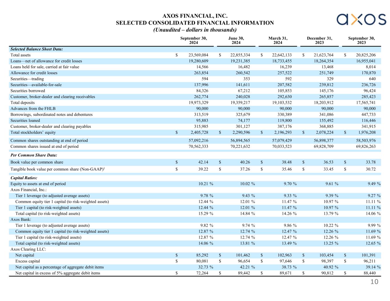 10 September 30, 2023 December 31, 2023 March 31, 2024 June 30, 2024 September 30, 2024 Selected Balance Sheet Data: $ 20,825,206$ 21,623,764$ 22,642,133$ 22,855,334$ 23,569,084Total assets 16,955,04118,264,35418,733,45519,231,38519,280,609Loans—net of allowance for credit losses 8,01413,46816,23916,48214,566Loans held for sale, carried at fair value 170,870251,749257,522260,542263,854Allowance for credit losses 640329592353594Securities—trading 236,726239,812207,582141,611137,996Securities—available-for-sale 96,424145,176105,85367,21284,326Securities borrowed 285,423265,857292,630240,028262,774Customer, broker-dealer and clearing receivables 17,565,74118,203,91219,103,53219,359,21719,973,329Total deposits 90,00090,00090,00090,00090,000Advances from the FHLB 447,733341,086330,389325,679313,519Borrowings, subordinated notes and debentures 116,446155,492119,80074,17795,883Securities loaned 341,915368,885387,176301,127315,985Customer, broker-dealer and clearing payables $ 1,976,208$ 2,078,224$ 2,196,293$ 2,290,596$ 2,405,728Total stockholders’ equity 58,503,97656,898,37757,079,42956,894,56557,092,216Common shares outstanding at end of period 69,826,26369,828,70970,033,52370,221,63270,562,333Common shares issued at end of period Per Common Share Data: $ 33.78$ 36.53$ 38.48$ 40.26$ 42.14Book value per common share $ 30.72$ 33.45$ 35.46$ 37.26$ 39.22Tangible book value per common share (Non-GAAP)1 Capital Ratios: 9.49 %9.61 %9.70 %10.02 %10.21 %Equity to assets at end of period Axos Financial, Inc.: 9.27 %9.39 %9.33 %9.43 %9.78 %Tier 1 leverage (to adjusted average assets) 11.11 %10.97 %11.47 %12.01 %12.44 %Common equity tier 1 capital (to risk-weighted assets) 11.11 %10.97 %11.47 %12.01 %12.44 %Tier 1 capital (to risk-weighted assets) 14.06 %13.79 %14.26 %14.84 %15.29 %Total capital (to risk-weighted assets) Axos Bank: 9.99 %10.22 %9.86 %9.74 %9.82 %Tier 1 leverage (to adjusted average assets) 11.69 %12.26 %12.47 %12.74 %12.87 %Common equity tier 1 capital (to risk-weighted assets) 11.69 %12.26 %12.47 %12.74 %12.87 %Tier 1 capital (to risk-weighted assets) 12.65 %13.25 %13.49 %13.81 %14.06 %Total capital (to risk-weighted assets) Axos Clearing LLC: $ 101,391$ 103,454$ 102,963$ 101,462$ 85,292Net capital $ 96,211$ 98,397$ 97,646$ 96,654$ 80,081Excess capital 39.14 %40.92 %38.73 %42.21 %32.73 %Net capital as a percentage of aggregate debit items $ 88,440$ 90,812$ 89,671$ 89,442$ 72,264Net capital in excess of 5% aggregate debit items AXOS FINANCIAL, INC. SELECTED CONSOLIDATED FINANCIAL INFORMATION (Unaudited – dollars in thousands)