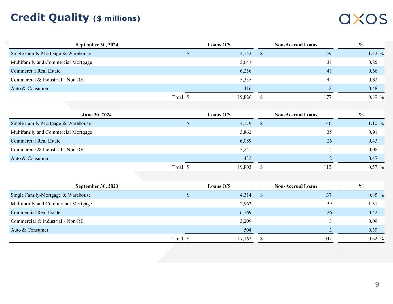 9 Credit Quality ($ millions) %Non-Accrual LoansLoans O/SSeptember 30, 2024 1.42 %$ 59$ 4,152Single Family-Mortgage & Warehouse 0.85313,647Multifamily and Commercial Mortgage 0.66416,256Commercial Real Estate 0.82445,355Commercial & Industrial - Non-RE 0.482416Auto & Consumer 0.89 %$ 177$ 19,826Total %Non-Accrual LoansLoans O/SJune 30, 2024 1.10 %$ 46$ 4,179Single Family-Mortgage & Warehouse 0.91353,862Multifamily and Commercial Mortgage 0.43266,089Commercial Real Estate 0.0845,241Commercial & Industrial - Non-RE 0.472432Auto & Consumer 0.57 %$ 113$ 19,803Total %Non-Accrual LoansLoans O/SSeptember 30, 2023 0.85 %$ 37$ 4,314Single Family-Mortgage & Warehouse 1.31392,962Multifamily and Commercial Mortgage 0.42266,169Commercial Real Estate 0.0933,209Commercial & Industrial - Non-RE 0.392508Auto & Consumer 0.62 %$ 107$ 17,162Total