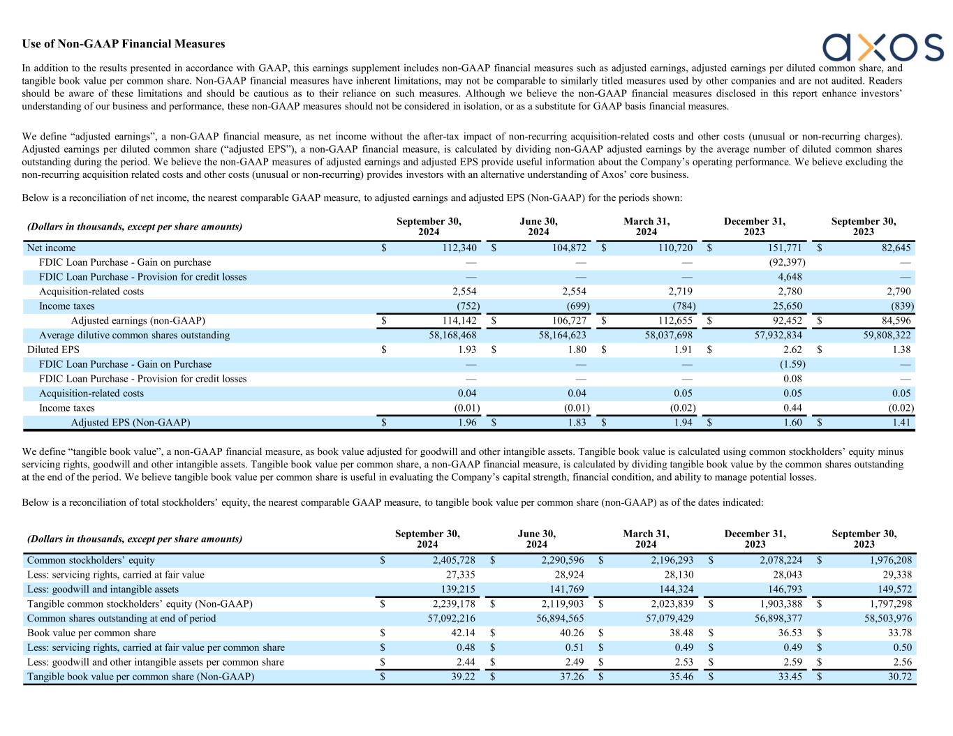September 30, 2023 December 31, 2023 March 31, 2024 June 30, 2024 September 30, 2024(Dollars in thousands, except per share amounts) $ 82,645$ 151,771$ 110,720$ 104,872$ 112,340Net income —(92,397)———FDIC Loan Purchase - Gain on purchase —4,648———FDIC Loan Purchase - Provision for credit losses 2,7902,7802,7192,5542,554Acquisition-related costs (839)25,650(784)(699)(752)Income taxes $ 84,596$ 92,452$ 112,655$ 106,727$ 114,142Adjusted earnings (non-GAAP) 59,808,32257,932,83458,037,69858,164,62358,168,468Average dilutive common shares outstanding $ 1.38$ 2.62$ 1.91$ 1.80$ 1.93Diluted EPS —(1.59)———FDIC Loan Purchase - Gain on Purchase —0.08———FDIC Loan Purchase - Provision for credit losses 0.050.050.050.040.04Acquisition-related costs (0.02)0.44(0.02)(0.01)(0.01)Income taxes $ 1.41$ 1.60$ 1.94$ 1.83$ 1.96Adjusted EPS (Non-GAAP) We define “tangible book value”, a non-GAAP financial measure, as book value adjusted for goodwill and other intangible assets. Tangible book value is calculated using common stockholders’ equity minus servicing rights, goodwill and other intangible assets. Tangible book value per common share, a non-GAAP financial measure, is calculated by dividing tangible book value by the common shares outstanding at the end of the period. We believe tangible book value per common share is useful in evaluating the Company’s capital strength, financial condition, and ability to manage potential losses. Below is a reconciliation of total stockholders’ equity, the nearest comparable GAAP measure, to tangible book value per common share (non-GAAP) as of the dates indicated: September 30, 2023 December 31, 2023 March 31, 2024 June 30, 2024 September 30, 2024(Dollars in thousands, except per share amounts) $ 1,976,208$ 2,078,224$ 2,196,293$ 2,290,596$ 2,405,728Common stockholders’ equity 29,33828,04328,13028,92427,335Less: servicing rights, carried at fair value 149,572146,793144,324141,769139,215Less: goodwill and intangible assets $ 1,797,298$ 1,903,388$ 2,023,839$ 2,119,903$ 2,239,178Tangible common stockholders’ equity (Non-GAAP) 58,503,97656,898,37757,079,42956,894,56557,092,216Common shares outstanding at end of period $ 33.78$ 36.53$ 38.48$ 40.26$ 42.14Book value per common share $ 0.50$ 0.49$ 0.49$ 0.51$ 0.48Less: servicing rights, carried at fair value per common share $ 2.56$ 2.59$ 2.53$ 2.49$ 2.44Less: goodwill and other intangible assets per common share $ 30.72$ 33.45$ 35.46$ 37.26$ 39.22Tangible book value per common share (Non-GAAP) Use of Non-GAAP Financial Measures In addition to the results presented in accordance with GAAP, this earnings supplement includes non-GAAP financial measures such as adjusted earnings, adjusted earnings per diluted common share, and tangible book value per common share. Non-GAAP financial measures have inherent limitations, may not be comparable to similarly titled measures used by other companies and are not audited. Readers should be aware of these limitations and should be cautious as to their reliance on such measures. Although we believe the non-GAAP financial measures disclosed in this report enhance investors’ understanding of our business and performance, these non-GAAP measures should not be considered in isolation, or as a substitute for GAAP basis financial measures. We define “adjusted earnings”, a non-GAAP financial measure, as net income without the after-tax impact of non-recurring acquisition-related costs and other costs (unusual or non-recurring charges). Adjusted earnings per diluted common share (“adjusted EPS”), a non-GAAP financial measure, is calculated by dividing non-GAAP adjusted earnings by the average number of diluted common shares outstanding during the period. We believe the non-GAAP measures of adjusted earnings and adjusted EPS provide useful information about the Company’s operating performance. We believe excluding the non-recurring acquisition related costs and other costs (unusual or non-recurring) provides investors with an alternative understanding of Axos’ core business. Below is a reconciliation of net income, the nearest comparable GAAP measure, to adjusted earnings and adjusted EPS (Non-GAAP) for the periods shown: