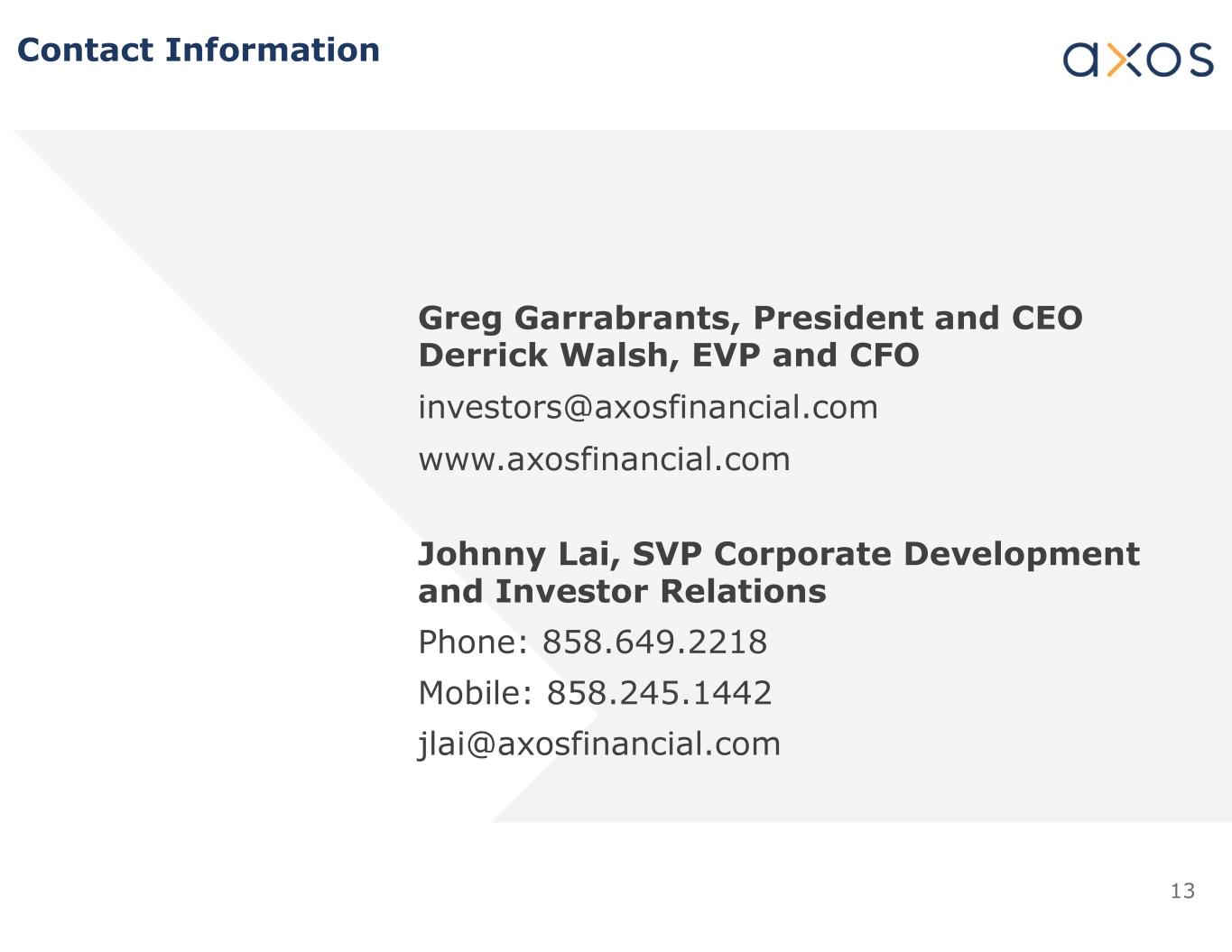 13 Greg Garrabrants, President and CEO Derrick Walsh, EVP and CFO investors@axosfinancial.com www.axosfinancial.com Johnny Lai, SVP Corporate Development and Investor Relations Phone: 858.649.2218 Mobile: 858.245.1442 jlai@axosfinancial.com Contact Information
