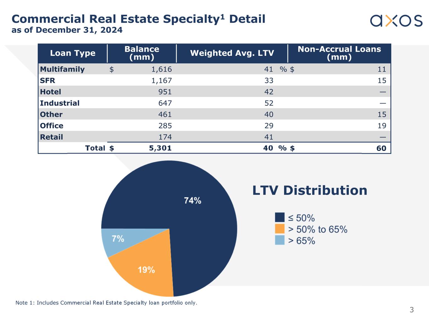 3 Commercial Real Estate Specialty1 Detail as of December 31, 2024 Non-Accrual Loans (mm)Weighted Avg. LTVBalance (mm)Loan Type $ 1141 %$ 1,616Multifamily 15331,167SFR —42951Hotel —52647Industrial 1540461Other 1929285Office —41174Retail $ 6040 %$ 5,301Total Note 1: Includes Commercial Real Estate Specialty loan portfolio only. LTV Distribution